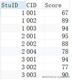 有一张成绩表T20191107,表结构为SC(StuID,CID,Score),分部对应是学生ID,课程ID和学生成绩,有如下测试数据