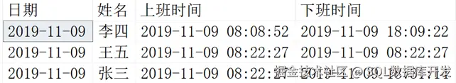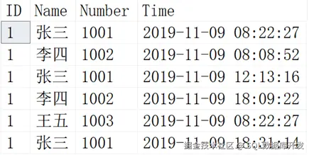 其中ID是主键,NAME为员工姓名,NO为工号,TIME为打卡时间 返回的结果如下: