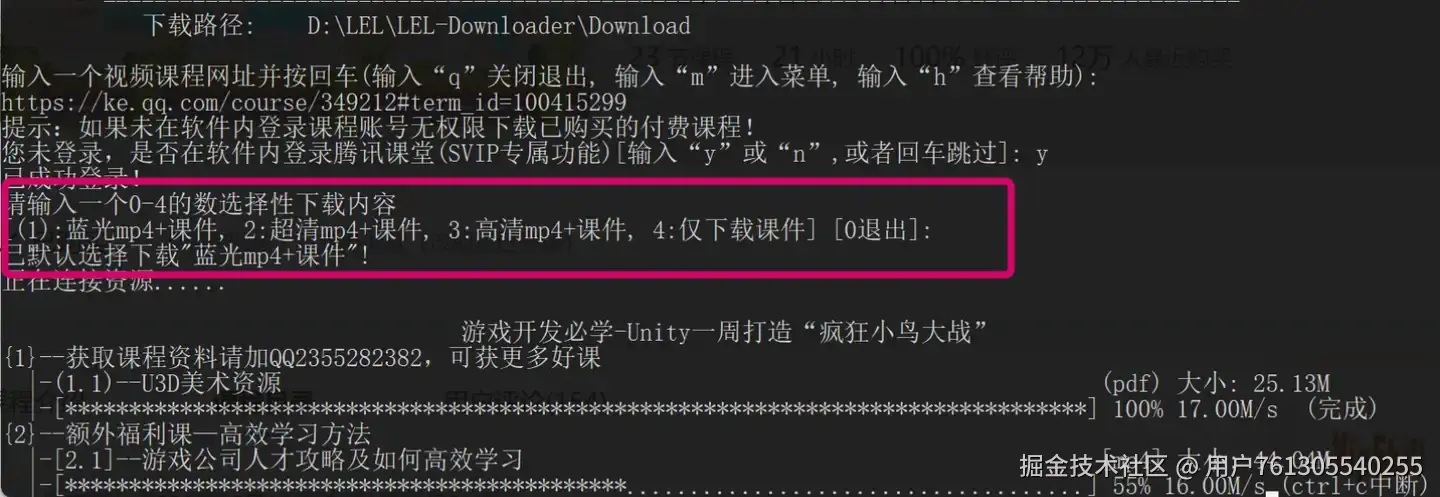 选择好下载的清晰度后,回车后就可以下载,可以看到下载的进度条,下载速度基本能跑满宽带,下载后的文件路径在界面上有提示。