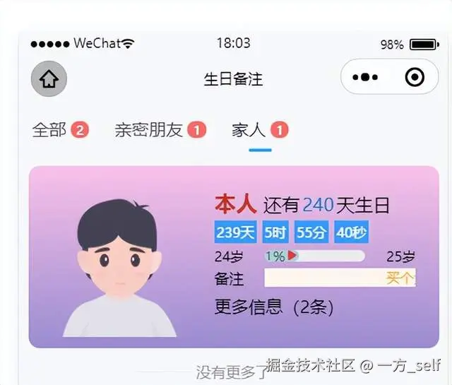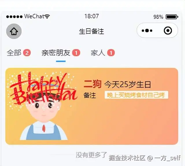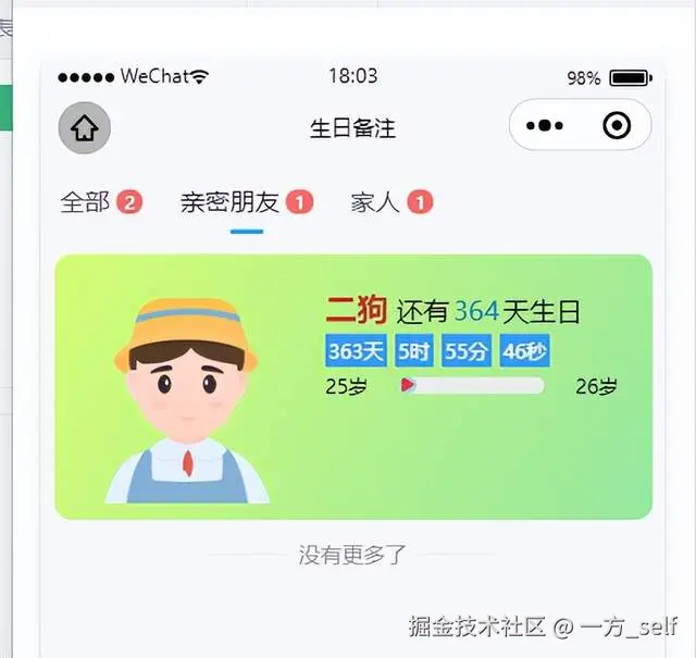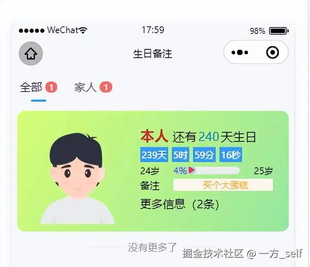 背景:因为记不住亲人的出生日期和多少岁和还有多久生日,用记事本也只能记录一串文字,不是特别方便,所以自己从零开发了这样一个小功能,能帮助自己记录亲人的生日信息。