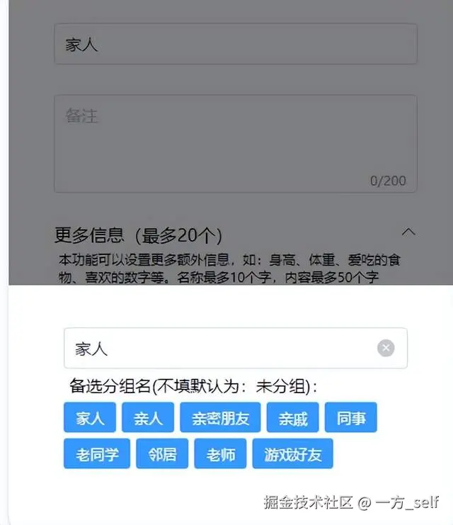 更多信息:可以设置更多特有的信息,如:喜欢吃的、身高、哪一年认识的、鞋码、手机号、身份证等等特有的信息。