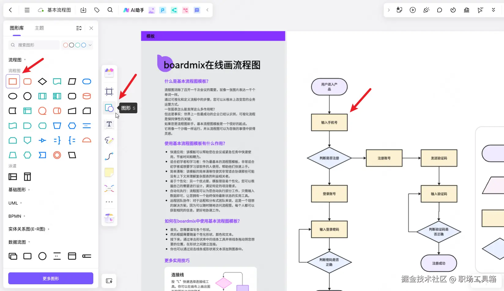 点击boardmix左侧工具栏的图形按钮,打开图形库面板,有丰富多样的形状和图标可供选择。用户可以根据流程图的需求,将各种形状拖拽到boardmix画布上。例如,选择矩形表示流程中的一个步骤,圆形表示决策点等。同时,还可以双击鼠标添加文本框,对每个步骤进行详细说明。