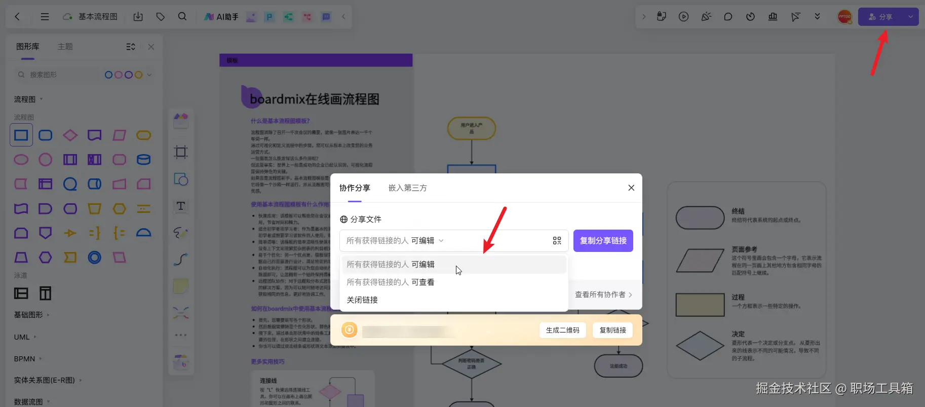 如果是团队协作项目,boardmix的多人在线协作绘图功能就非常实用。团队成员可以同时在同一个流程图上进行编辑和修改,实时看到彼此的操作。完成流程图后,可以点击boardmix画布右上角的“分享”按钮,通过生成分享链接的方式与他人分享,方便团队成员或客户查看和反馈。
