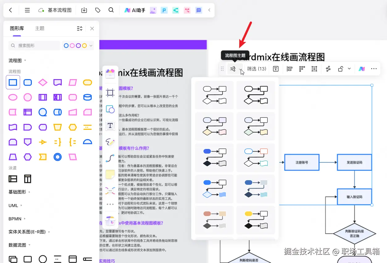 boardmix内置多款不同风格的主题,用户可以一键美化图形。鼠标框选整个流程图,点击工具栏的“流程图主题”,在弹出的面板,选择一个适合的流程图主题,可以使流程图的整体外观更加专业和美观。此外,还可以调整图形的颜色、大小、字体等属性,以满足个性化的需求。