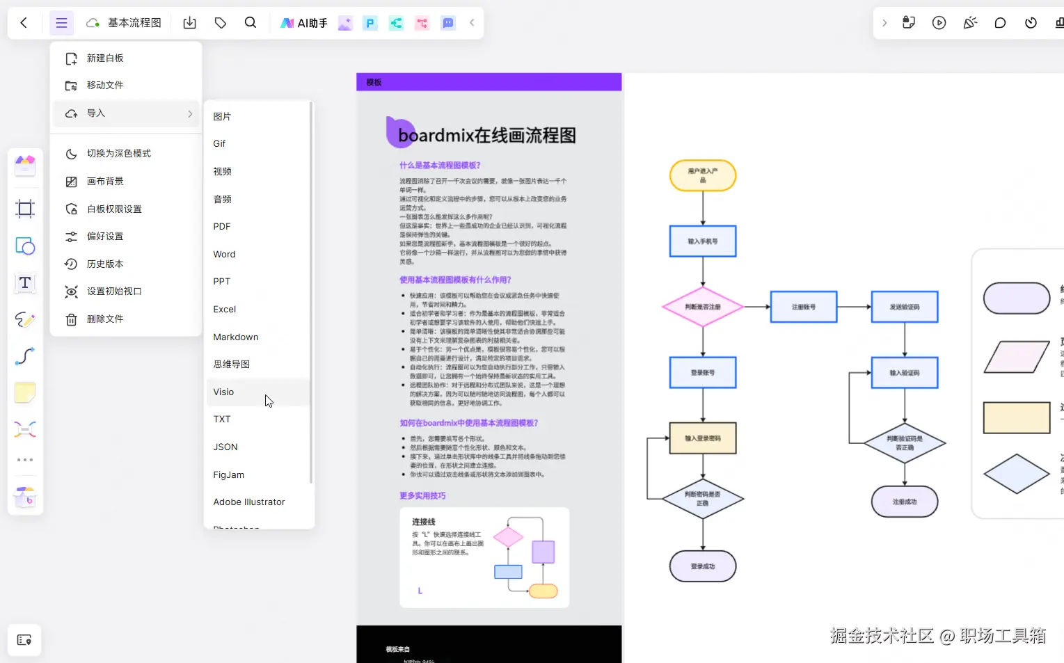 对于已经有Visio文件的用户,可以直接将Visio文件导入到boardmix中,继续进行编辑和完善。同时,boardmix支持多种文件格式的导出,如 PDF、PNG、SVG 等,满足不同场景下的使用需求。