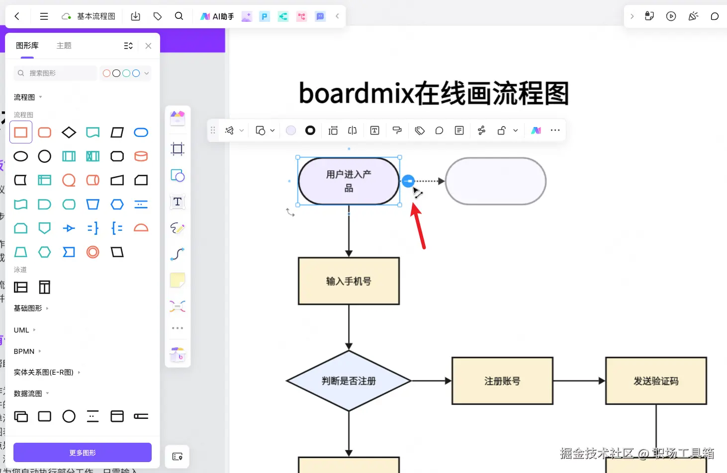 将不同的图形连接起来是绘制流程图的关键步骤。在boardmix中,用户可以轻松地通过点击图形边框外的 “添加节点” 来快速创建连接线。连接图形时,可以选择不同的线条样式和颜色,以区分不同类型的流程关系。