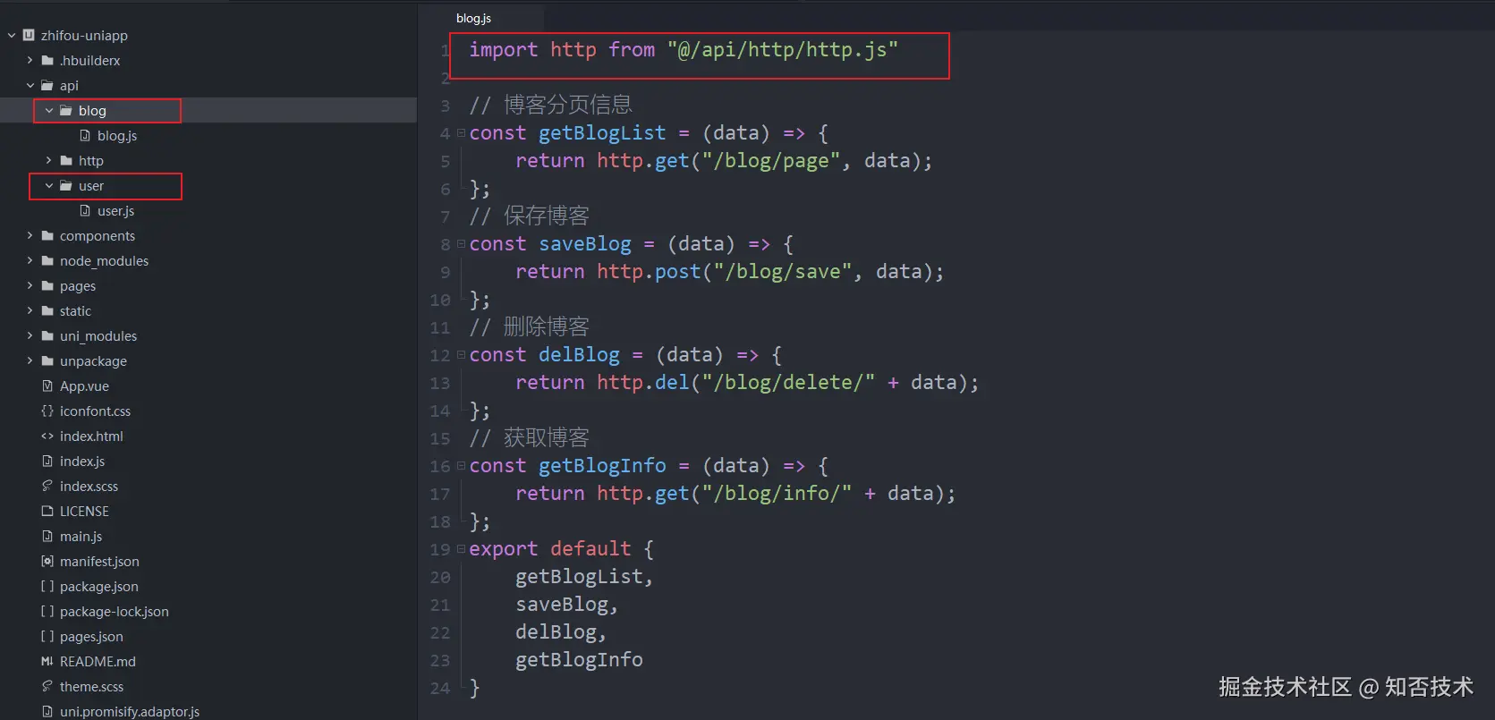 其中 user.js 和 blog.js 主要用来封装请求后端的 API