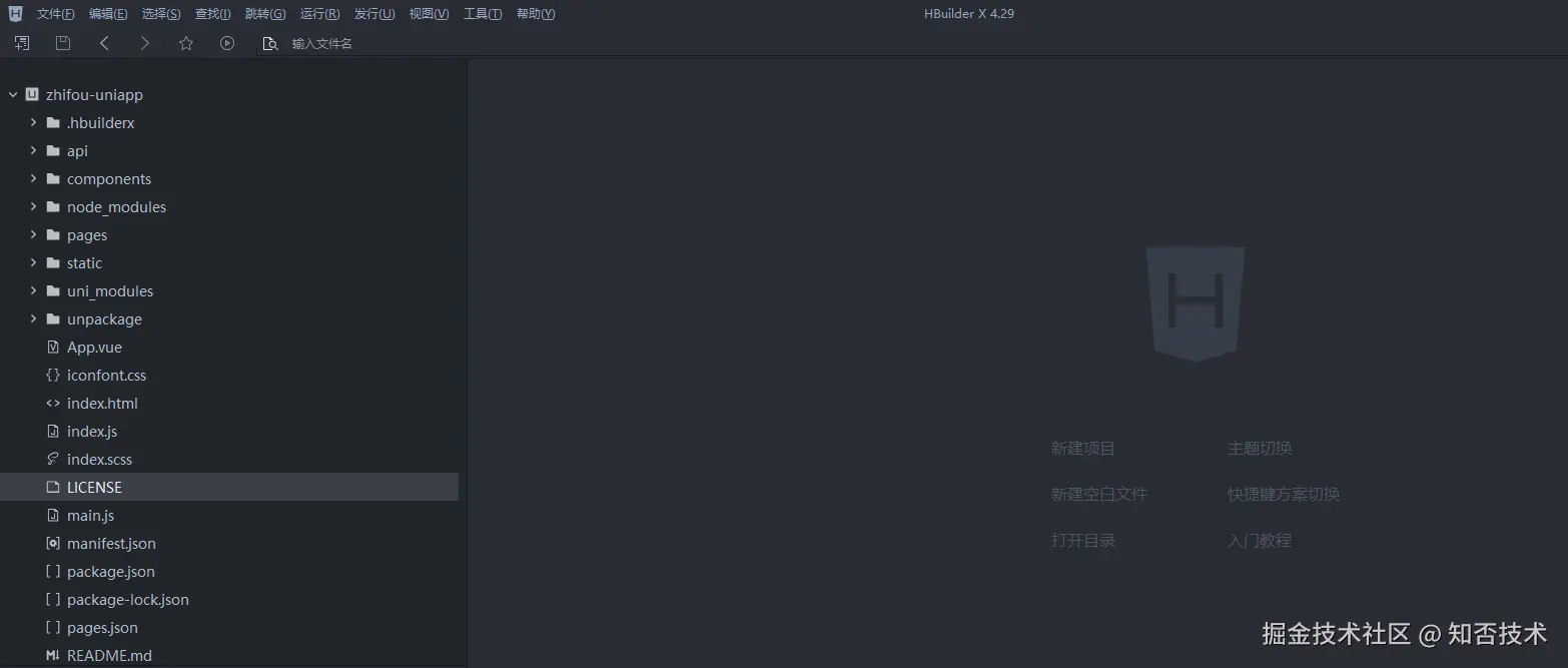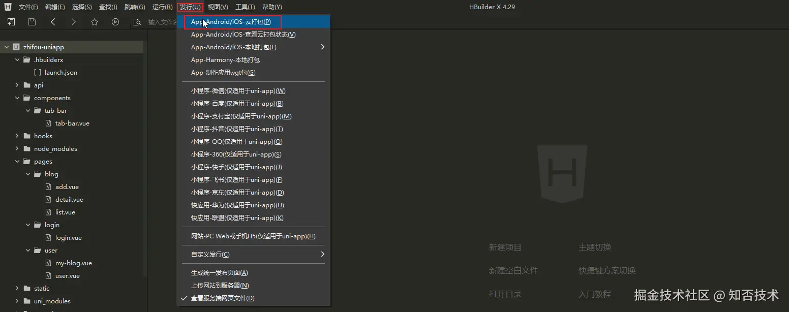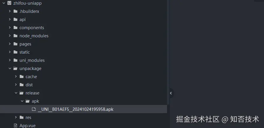 打包后的 app 文件在 zhifou-uniapp\unpackage\release\apk 这个路径下,然后通过微信等工具保存到手机本地,安装即可