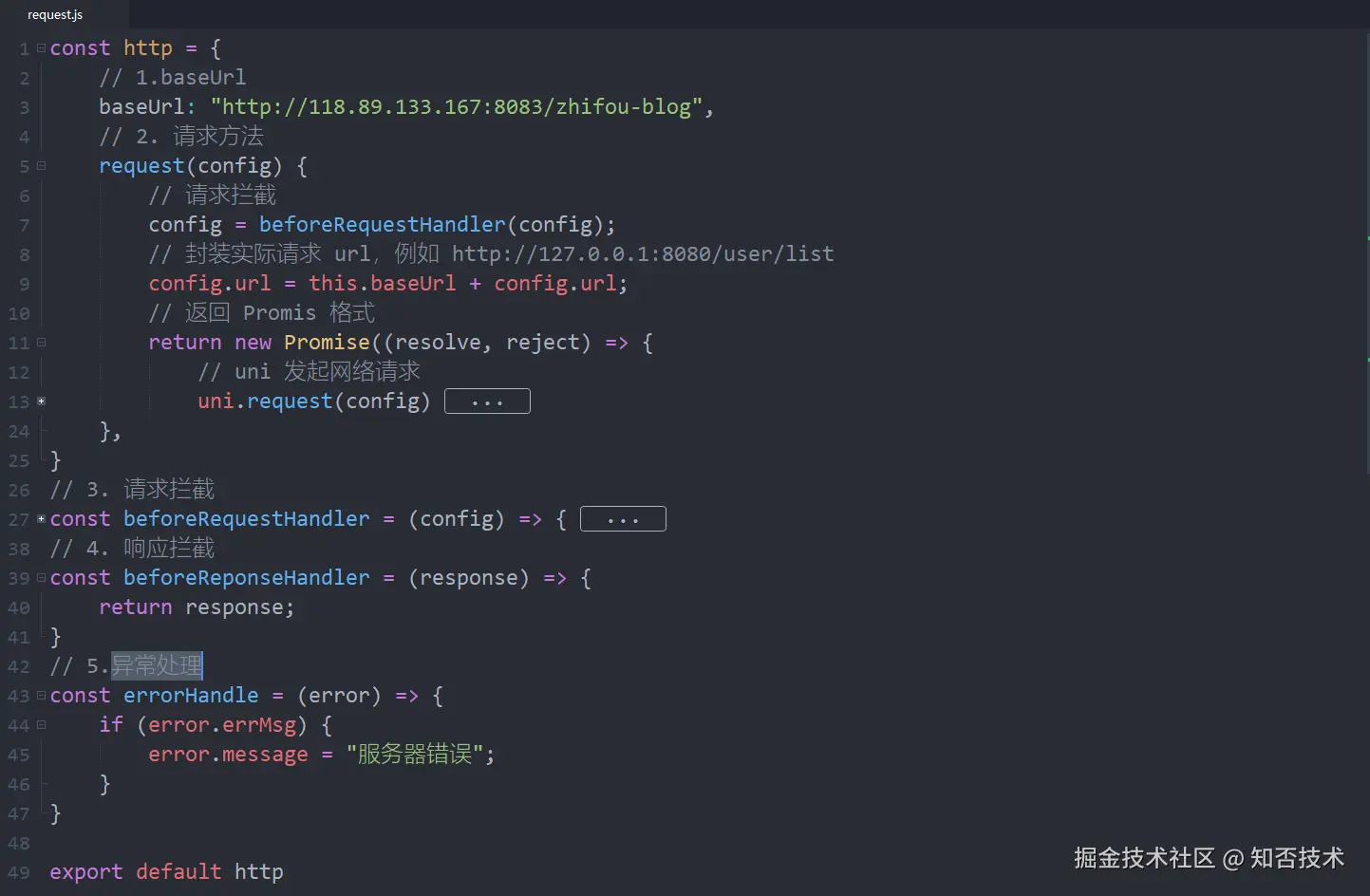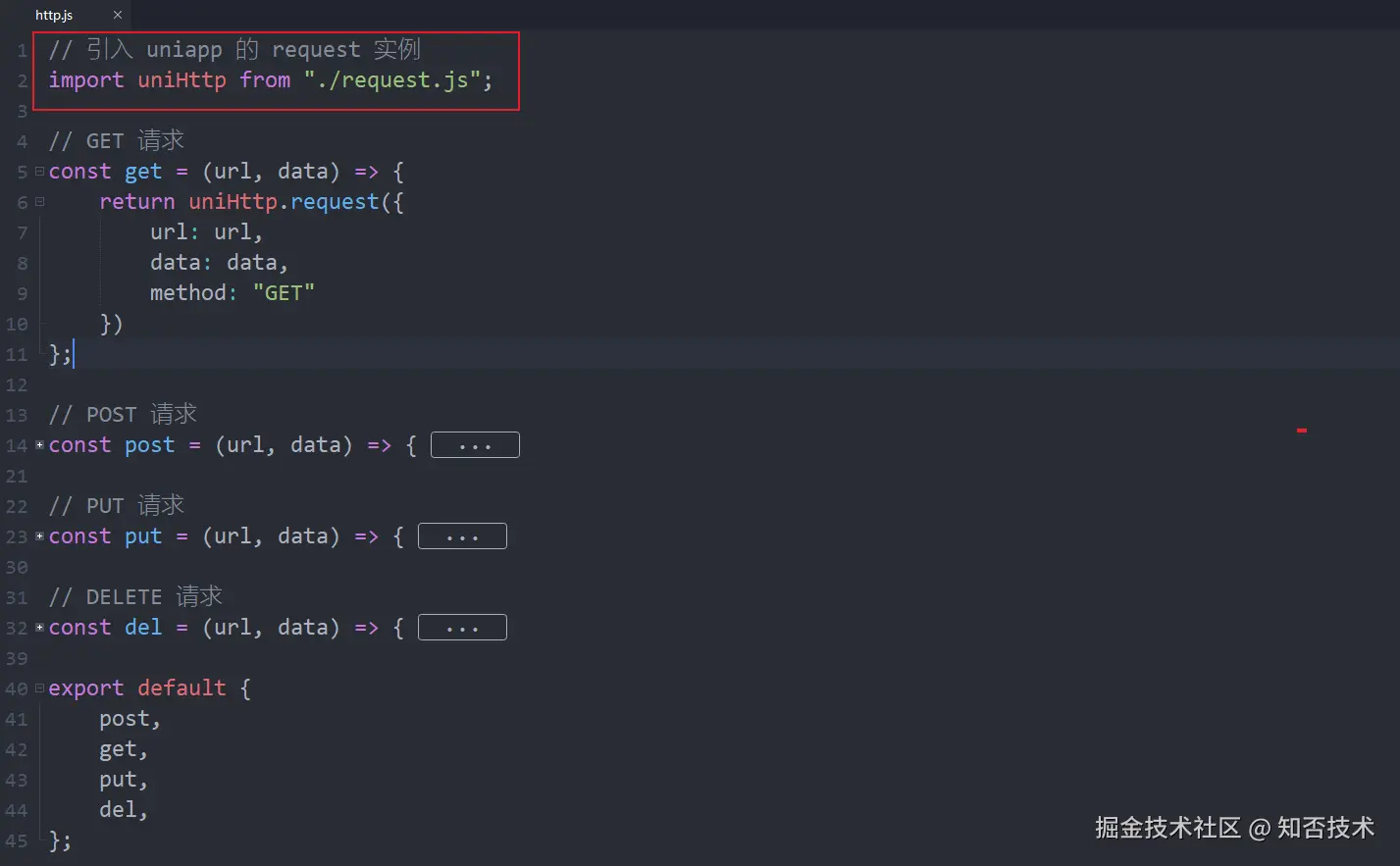 http.js 文件主要是引入 request.js 实例,然后封装 GET、POST、PUT、DELETE 方法