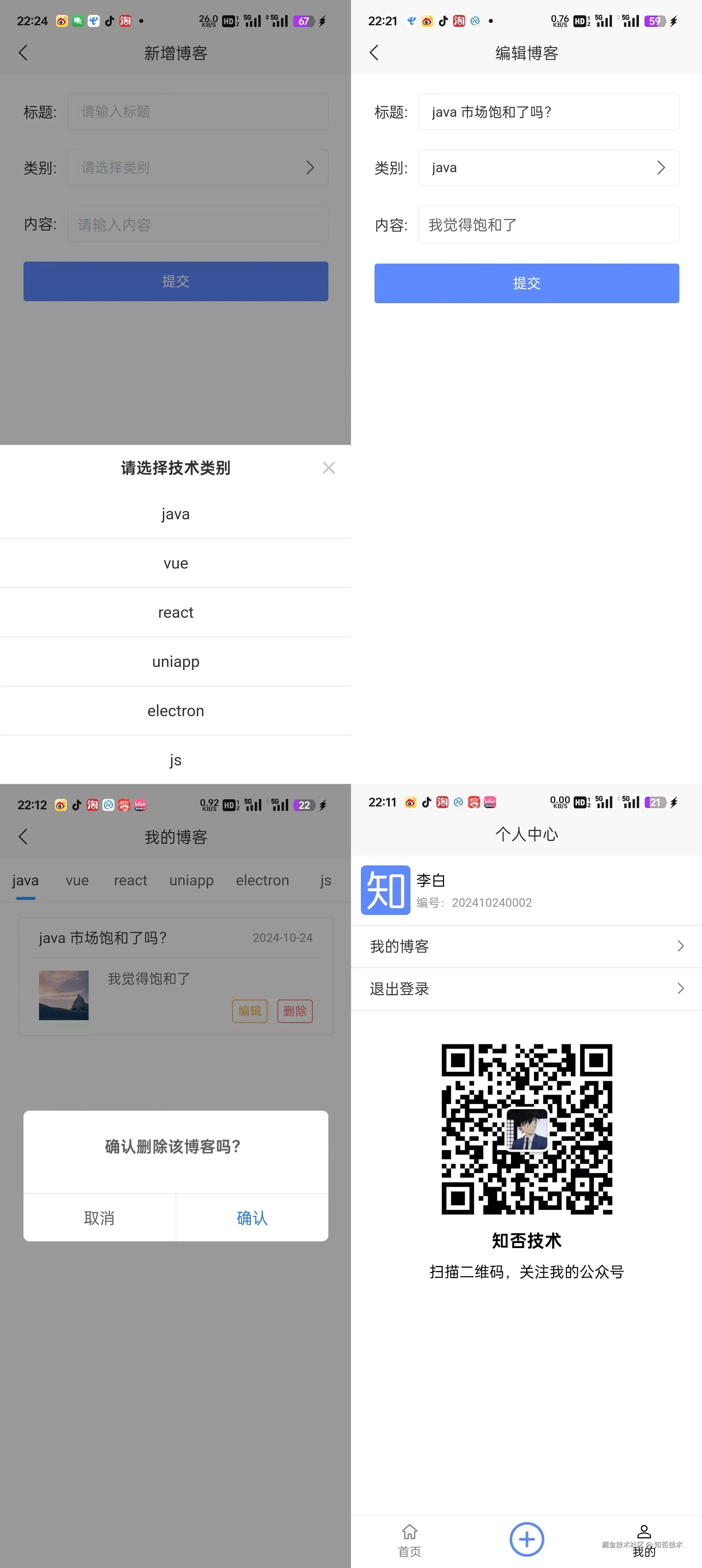 2.新增博客、编辑博客、删除博客、个人中心、退出登录