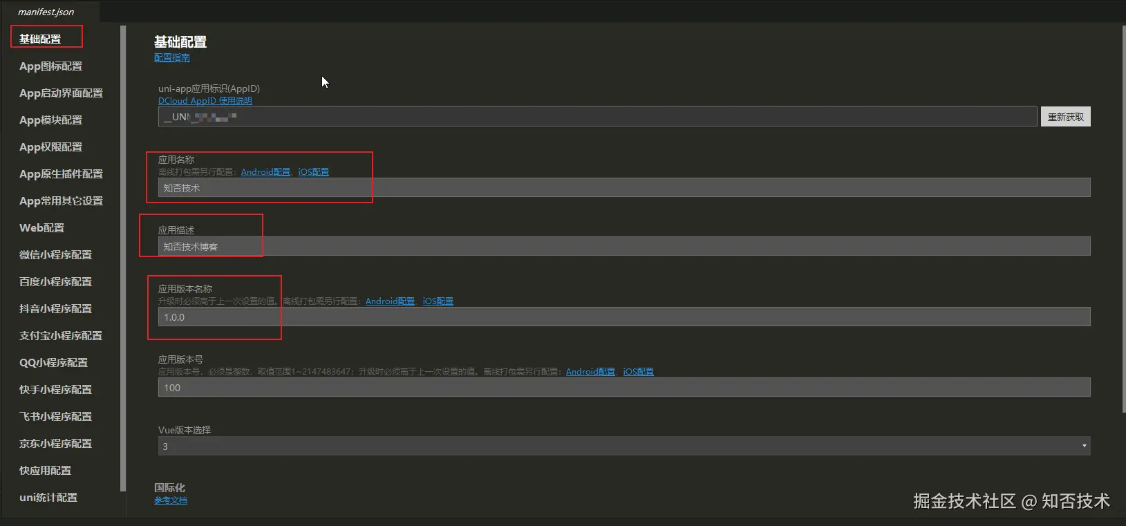 点击 manifest.json,配置应用标识、应用名称、描述和版本号。