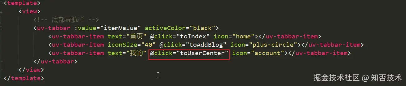 <uv-tabbar-item text="我的" @click="toUserCenter" icon="account"></uv-tabbar-item>