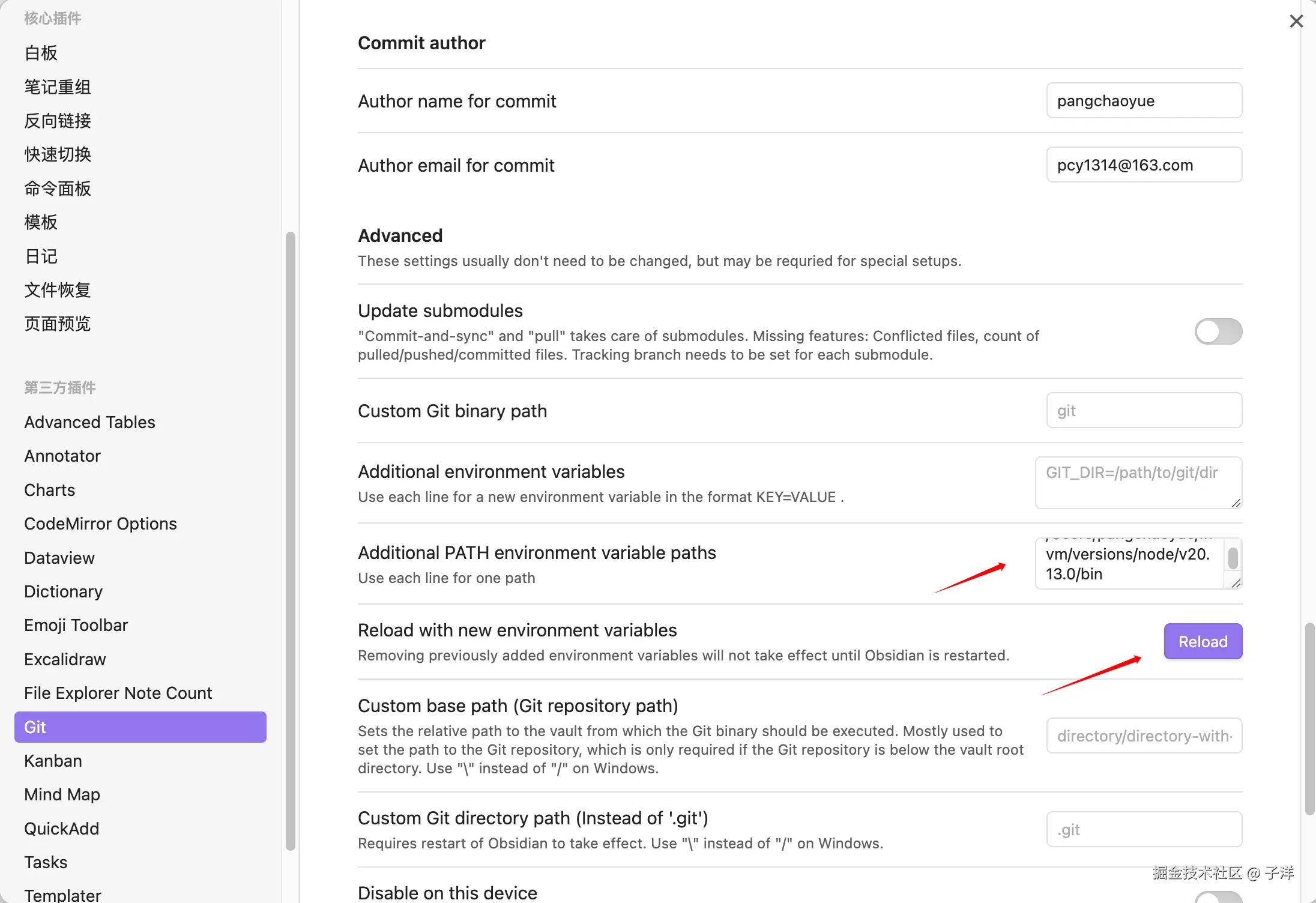 然后打开 Obsidian 的配置面板插到 Git 插件面板,然后在高级中找到 Additional PATH environment variable paths ,在后面的输入框中输入刚才获得的地址,在点击 reload 刷新环境变量,在去触发 Git 插件的推送后就正常了。