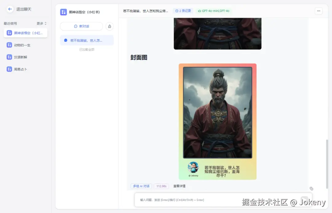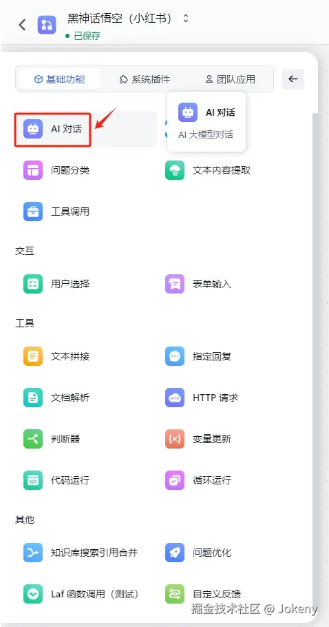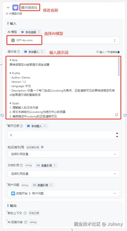 新增【AI 对话】节点,将我们输入的文案转换成合适的 AI 绘画提示词,也就是生成“黑神话悟空”的图片