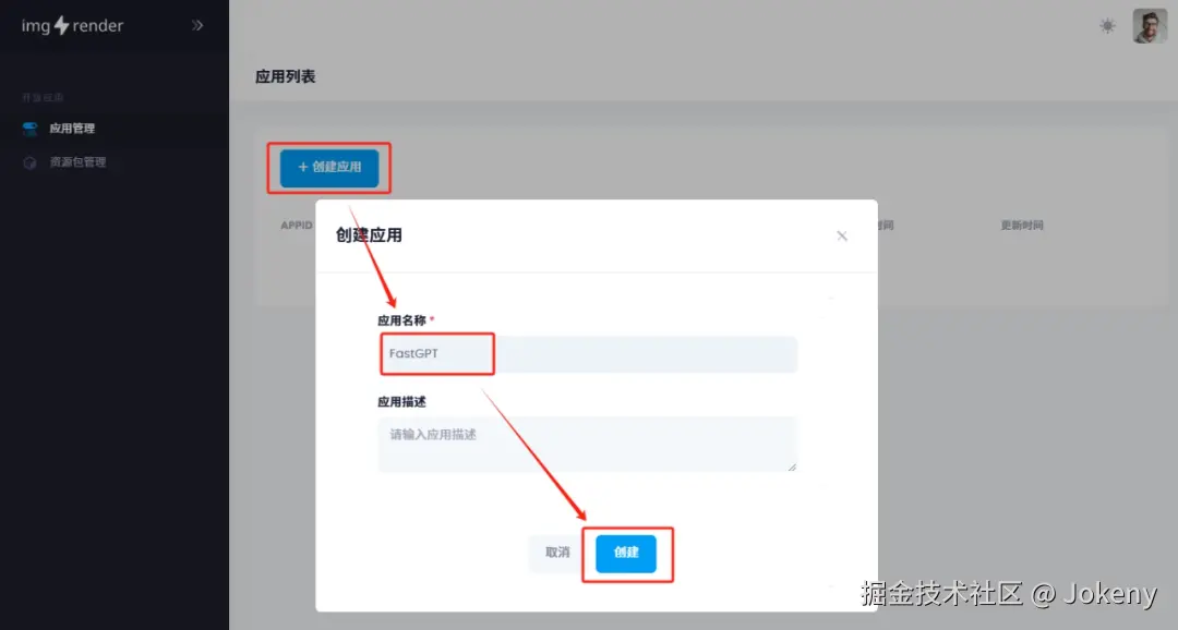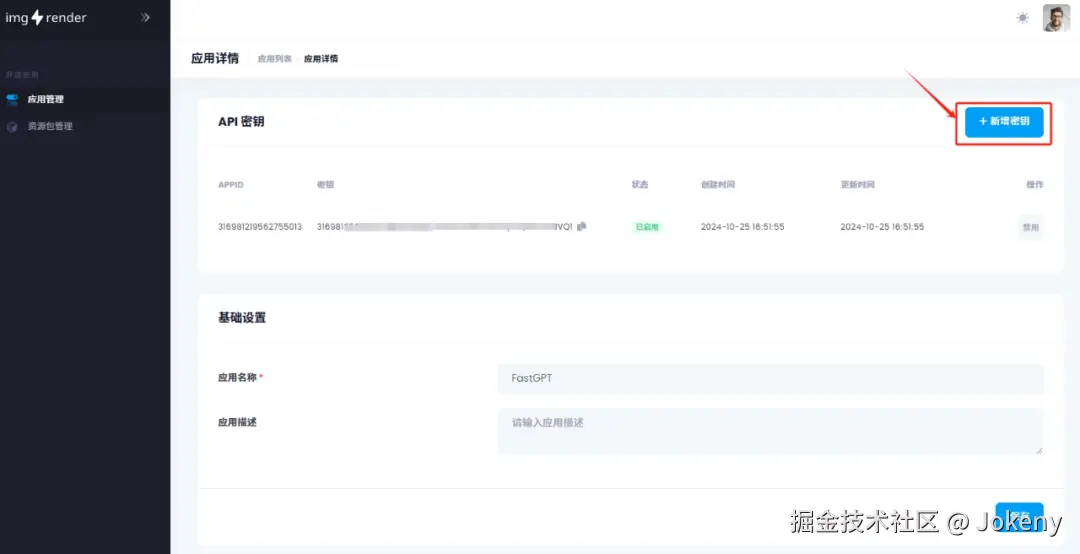 登录后进入后台,创建“应用”和“API”密钥,如下图:
