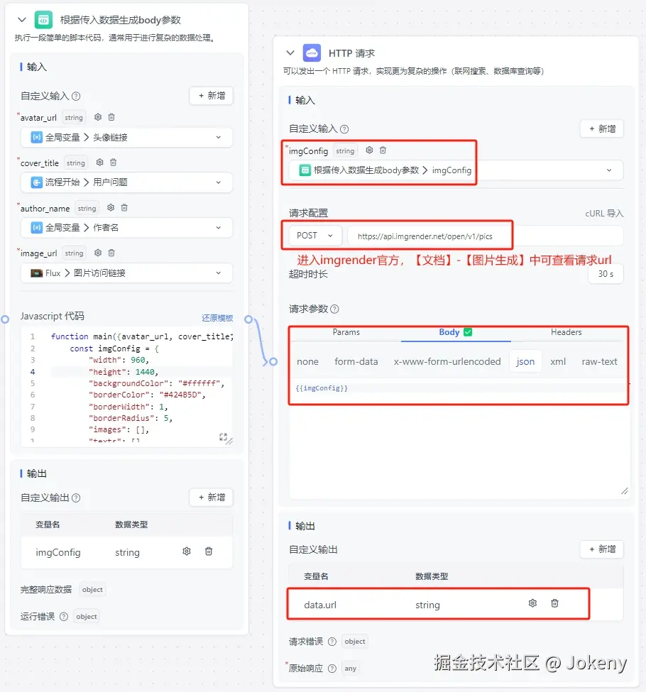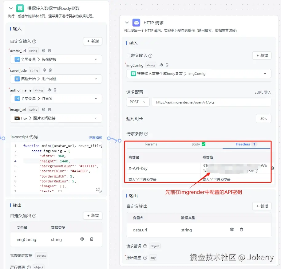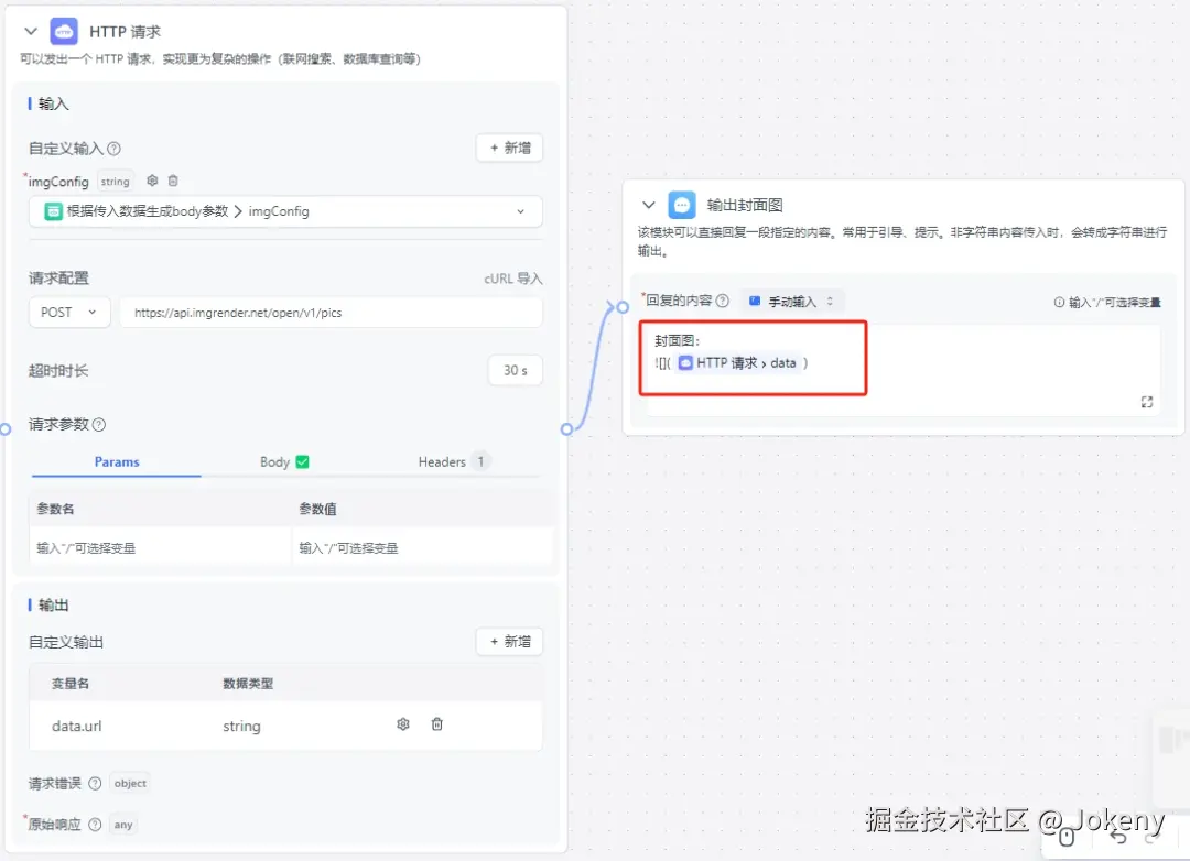 然后,新建【HTTP 请求】节点,调用 imgrender 的 API 开始生成封面图,需要传 body 参数和 API 密钥,请求 url 在 imgrender 官方获取。