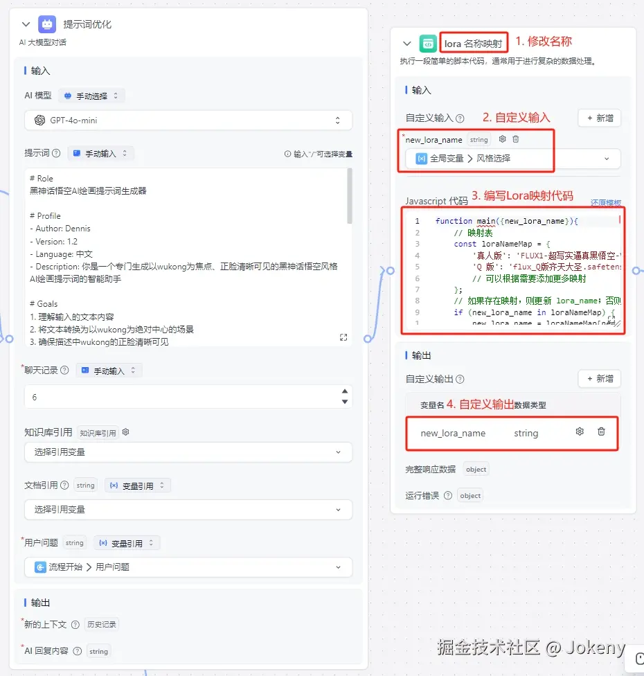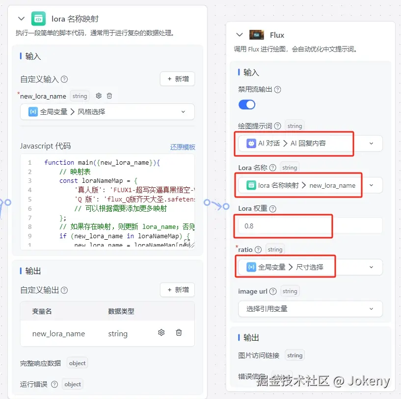 “系统配置”中的的全局变量使用了对人类比较友好的方式:提供了风格选择,这里我们需要将风格转换为 AI 绘画中的 Lora 模型名称,总共有两个黑神话悟空的 Lora 模型可供选择。
