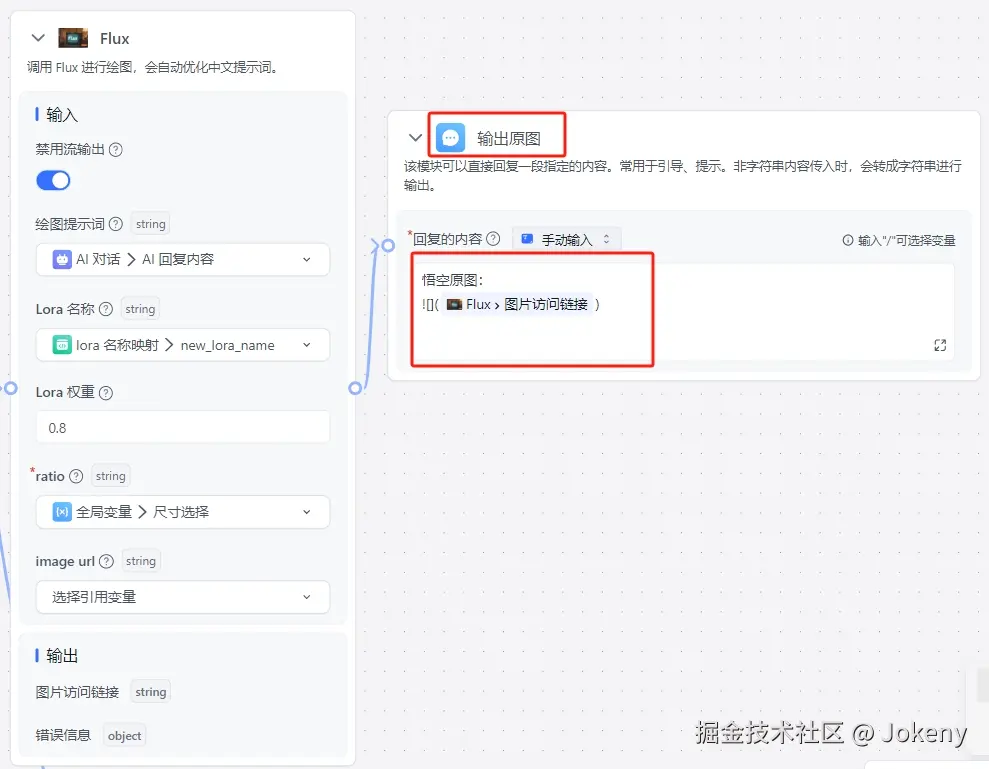 新建【Flux】节点,将绘图提示词、Lora名称、Lora权重和图片尺寸传入 Flux 节点,如下图: