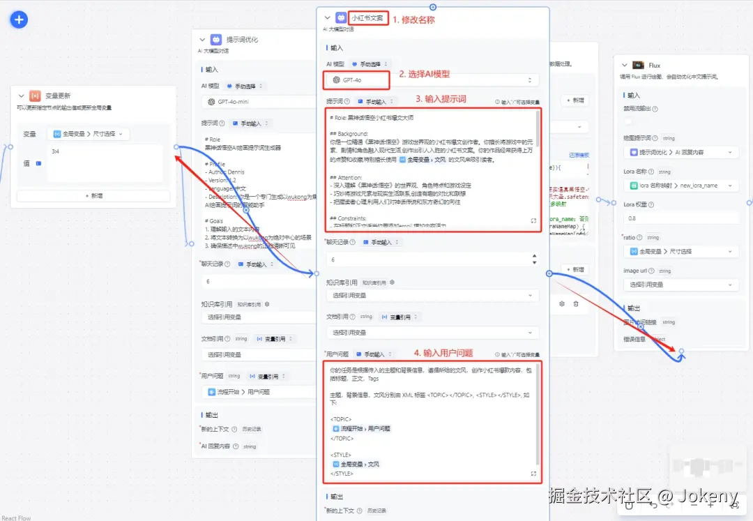 新建【AI 对话】节点,左边链接【变量更新】,右边链接【Flux】,该节点主要用于生成小红书文案,如下图: