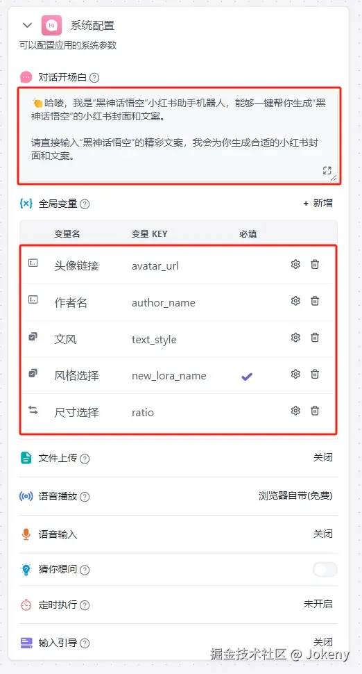 设置“对话开场白”和“全局变量”(包括头像链接、作者名、文风、风格选择、尺寸选择),后面根据大模型生成小红书文案时会用到,如下图: