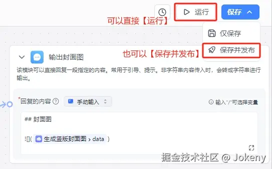 以上工作流就算完成了,可以点击右上角的【运行】,也可以【保存并发布】后在【聊天】中使用。