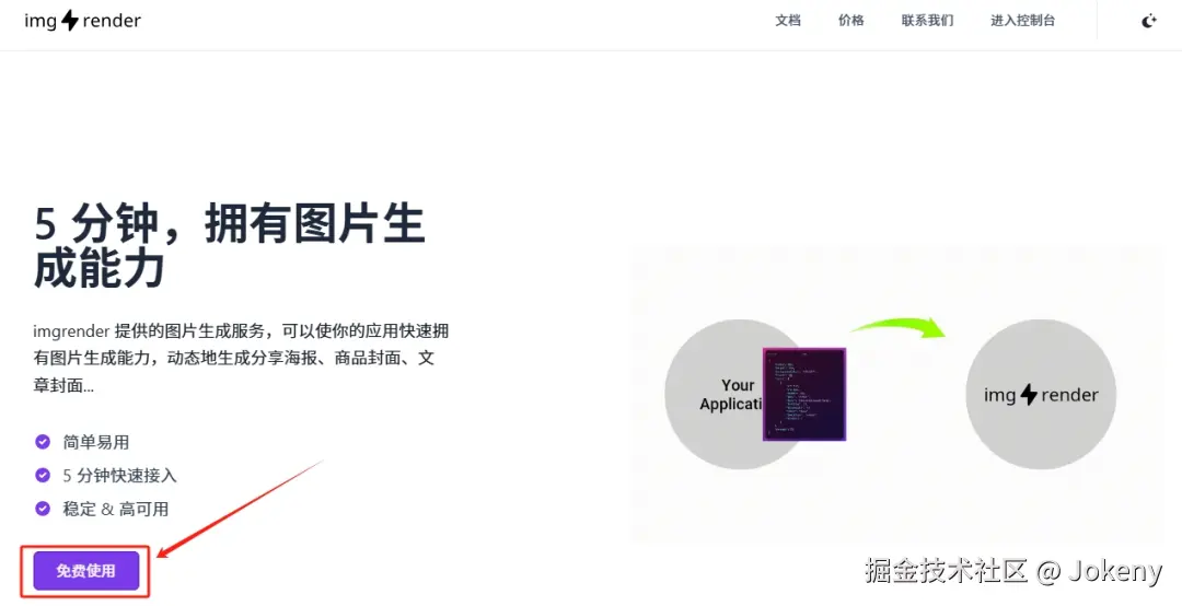 访问 imgrender 官网:www.imgrender.net/ 主要用来生成小红书封面,该服务免费每个月提供1000次的调用服务,对于个人使用来说足够了。