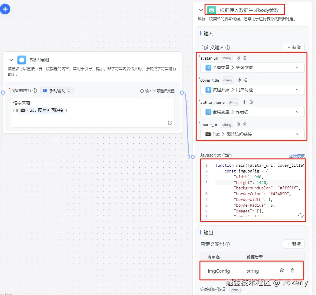 接着,再新建【代码运行】节点,根据传入的数据生成 body 参数,也就是生成小红书封面所需要的参数,如下图: