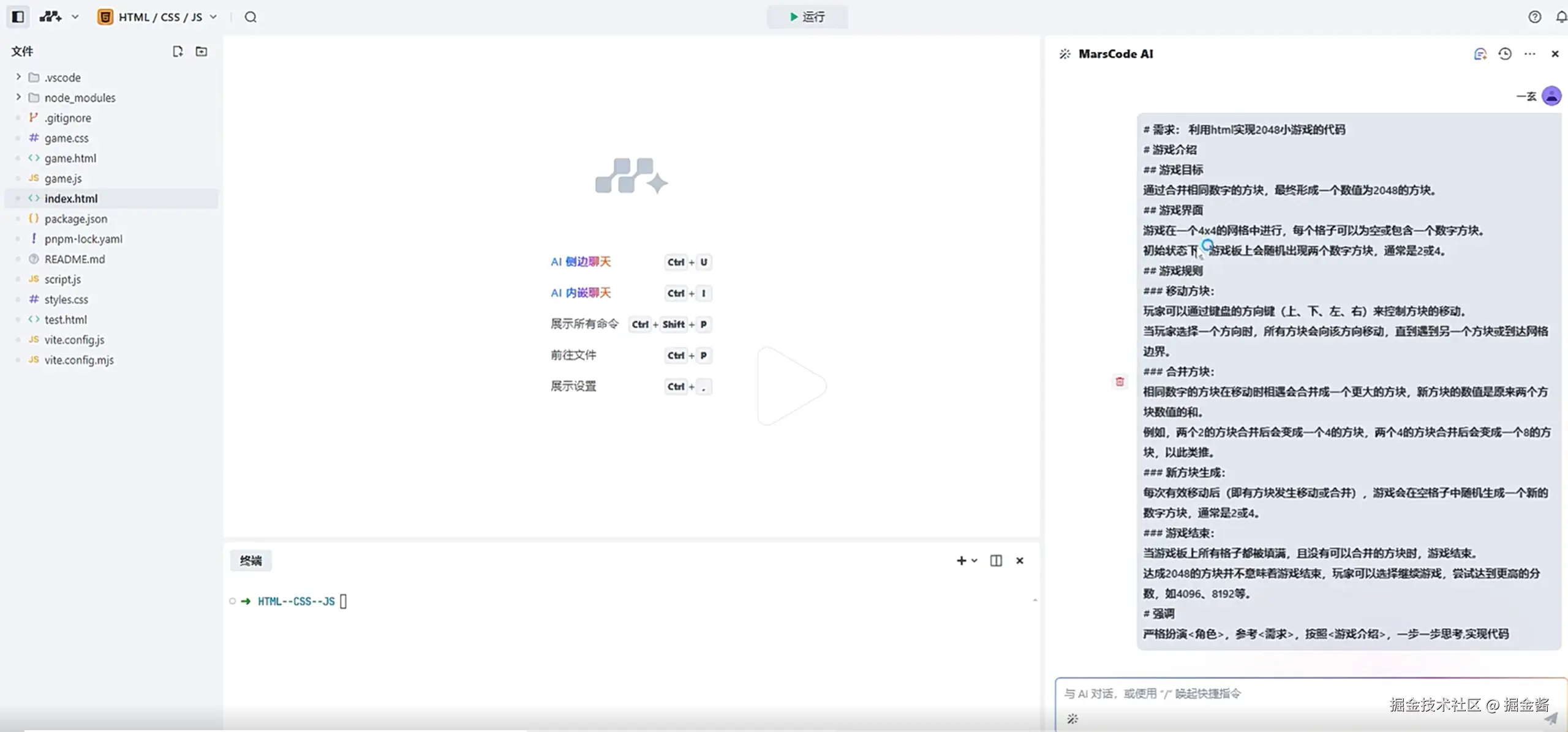 一句提示词就能实现2048小游戏?用户@一玄聊ai 利用豆包MarsCode做到了!在登录豆包MarsCode后,用户新建项目并输入prompt,涉及游戏的目标、界面、规则等等,之后MarsCode AI生成了代码示例,即使用JavaScript来处理游戏逻辑,HTML和CSS来构建用户界面。经过运行验证和试玩体验后,用户连连称赞,开发需求成功实现。AI编程助手不仅仅是对编程的挑战,更是对用户逻辑思维的极致考验,这也是豆包MarsCode希望帮助更多开发者用AI激发创造的初心所在。