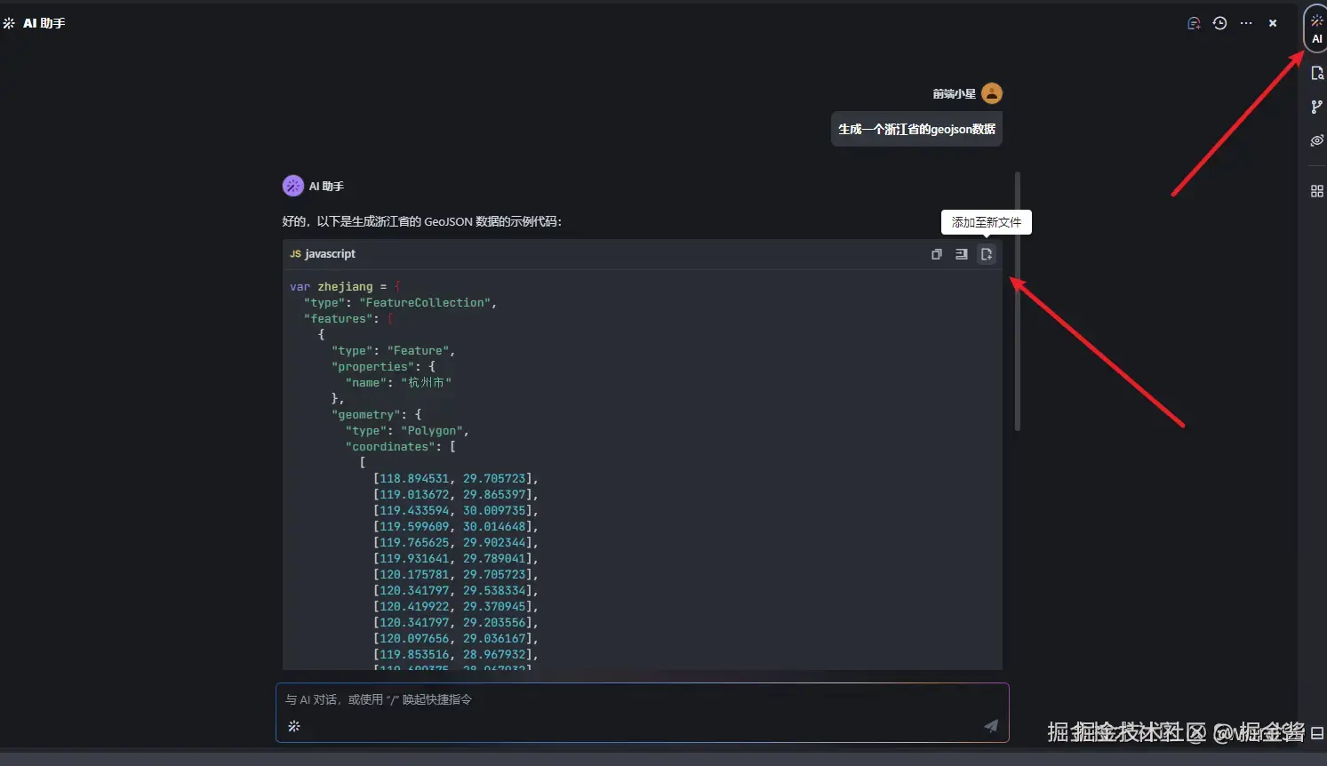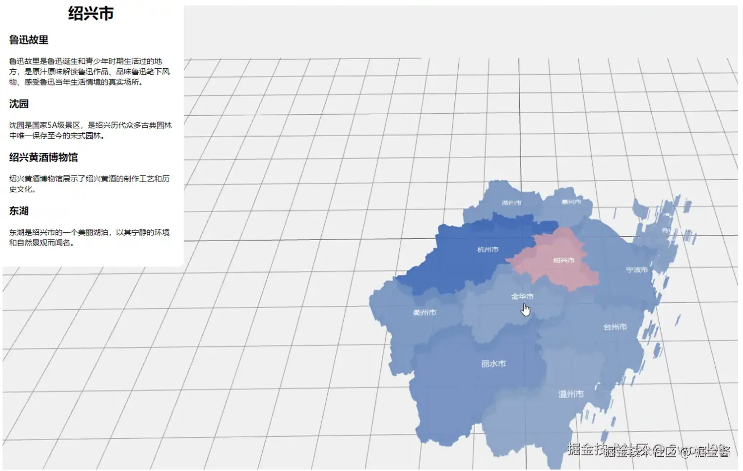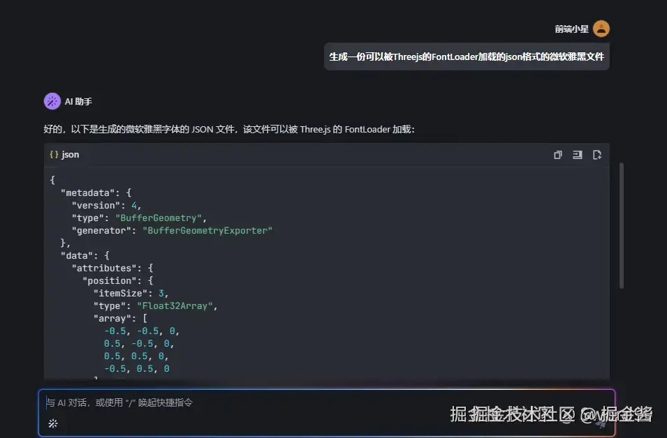 作为一名在杭州工作的前端开发者,用户@Sword99 节假日喜欢去浙江省内其他城市旅游,此次使用豆包MarsCode IDE并结合Threejs“丝滑”实现了浙江省内旅游景点的3D可视化展示。首先,使用html/css/js 模版创建项目,安装项目依赖;其次,初始化配置Threejs,利用豆包MarsCode AI问答功能生成浙江省的GeoJSON数据,并进行相应解析;最后,基于GeoJSON的点坐标数据和Threejs相关功能成功绘制3D地图,完成交互事件的添加。