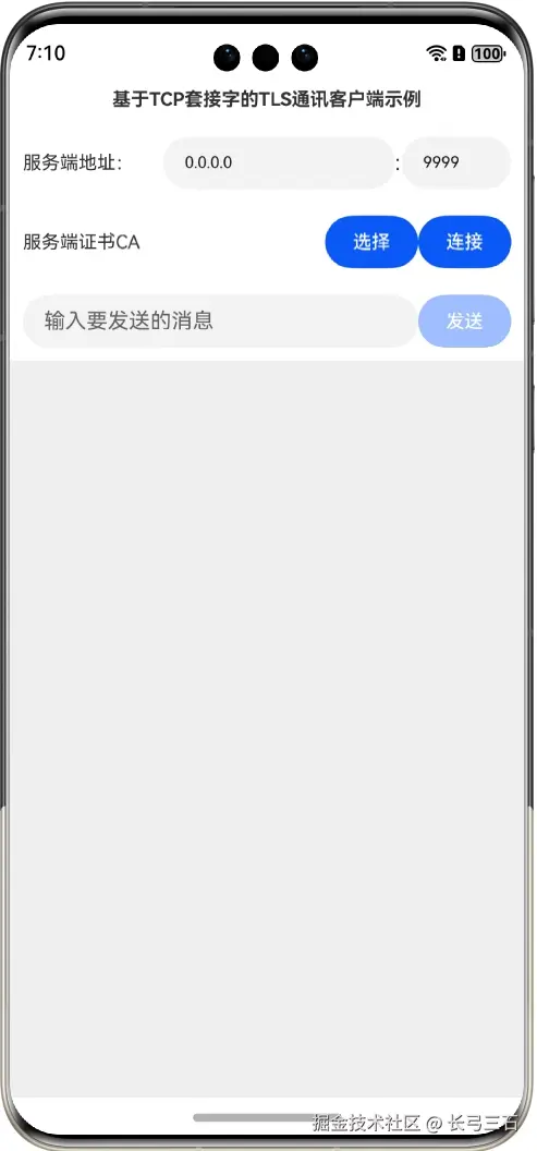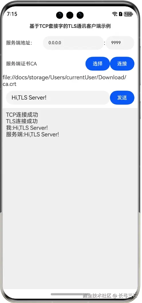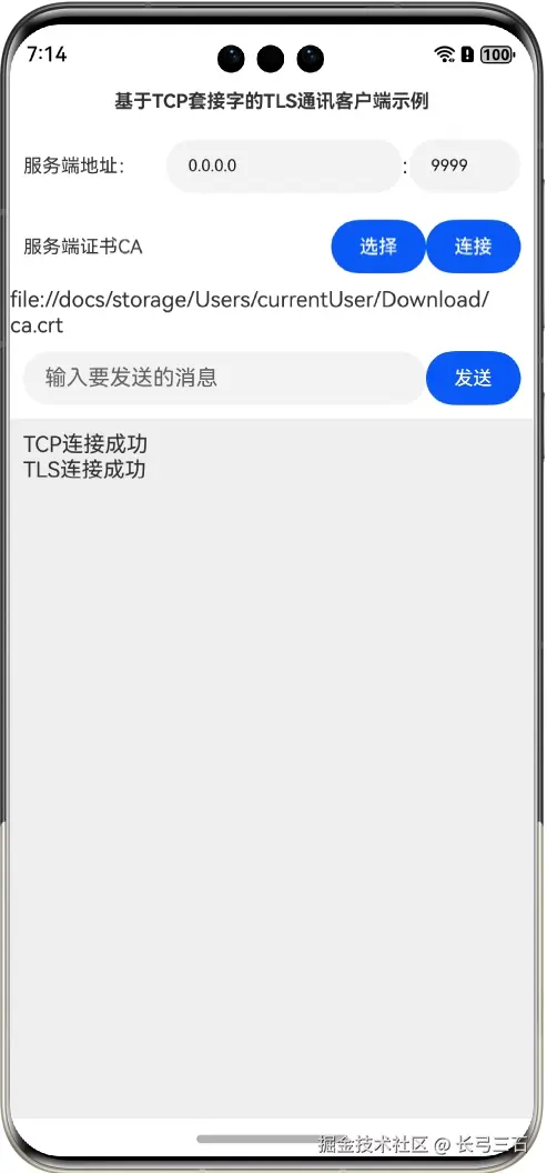 本文将通过一个示例演示上述过程,也就是首先建立一个TCP客户端,然后该客户端通过TCP协议和TLS服务端建立连接,然后再基于该TCP客户端创建TLS客户端,在配置好服务端CA证书后,再和TLS服务端建立连接,最后进行正常的TLS通讯,本示例可以使用在本系列第33篇文章《鸿蒙网络编程系列33-TLS回声服务器示例》中创建的TLS服务端,并且需要预先启动服务端。