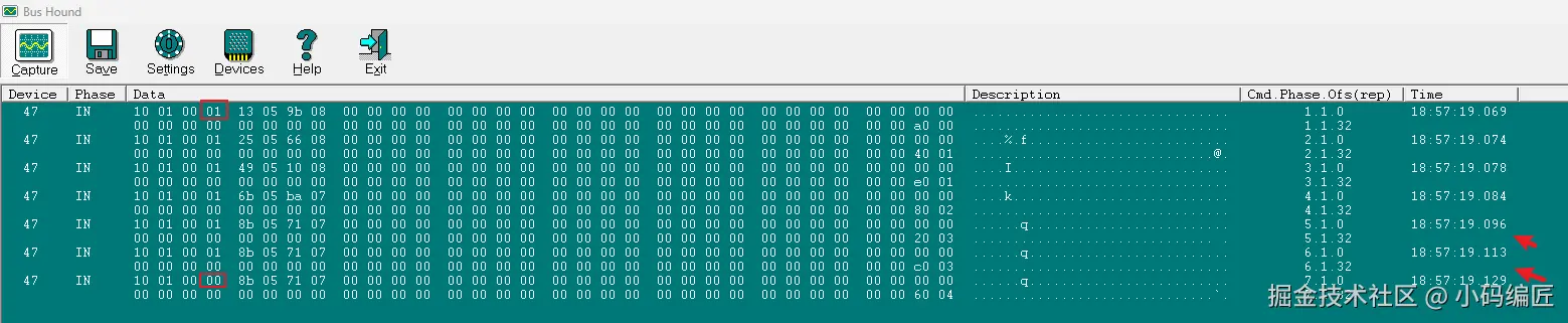 BusHold第4列数据,01是指Down/Move事件,00是指Up操作结束。我们看到Move操作输入间隔基本在16-17ms,说明触摸框真实报点间隔17ms左右,即60帧。