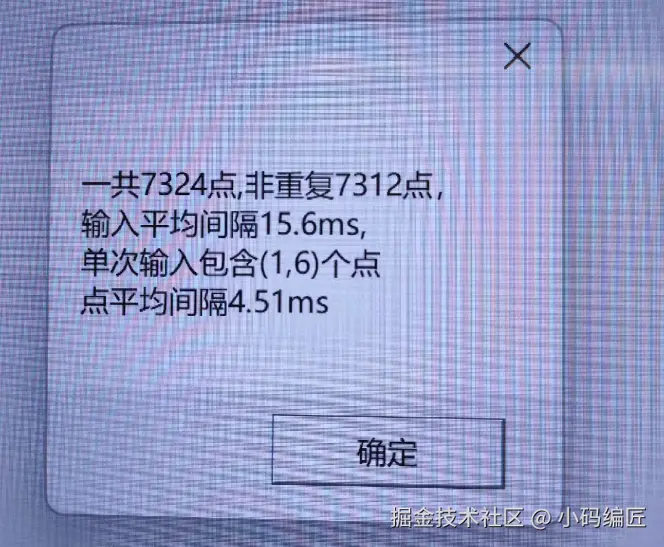 输入间隔没变也是15.6ms左右,触摸点之间平均间隔为4.5ms,即触摸框报点220帧左右,应用层触摸数据依然是60帧。说明这款触摸框提升了本身的报点率,但应用层根据硬件条件限制了60帧触摸报点。