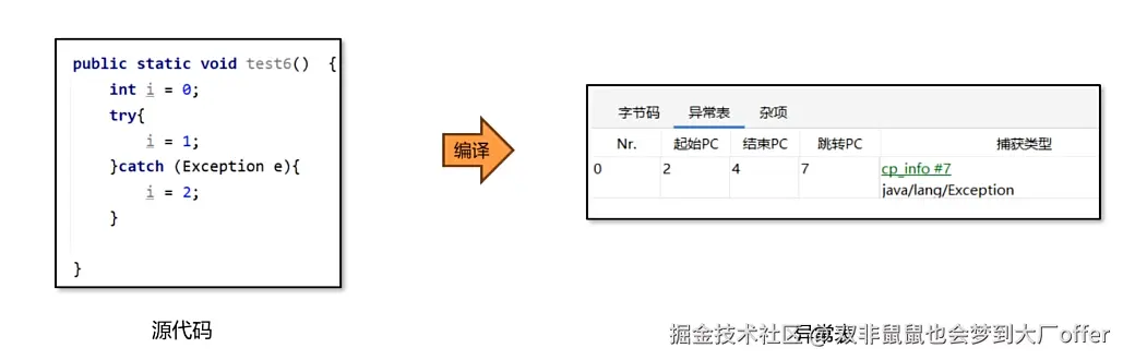 异常表存放的时代码中异常的处理信息,包含了异常捕获的生效范围以及异常发生后跳转到的字节码指令位置