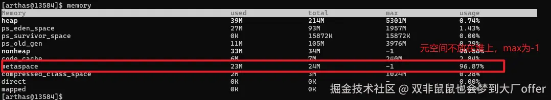Arthas中的heap堆内存使用了JMX技术中内存获取方式,这种方式与垃圾回收器有关**,计算的是可以分配对象的内存,**而不是整个内存方法区