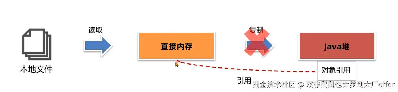 - IO操作比如读文件,需要先把文件读入直接内存(缓冲区)再把数据复制到Java堆中。现在直接放入直接内存即可,同时Java堆上维护直接内存的引用,减少了一次数据复制的开销,写文件也是同样思路。