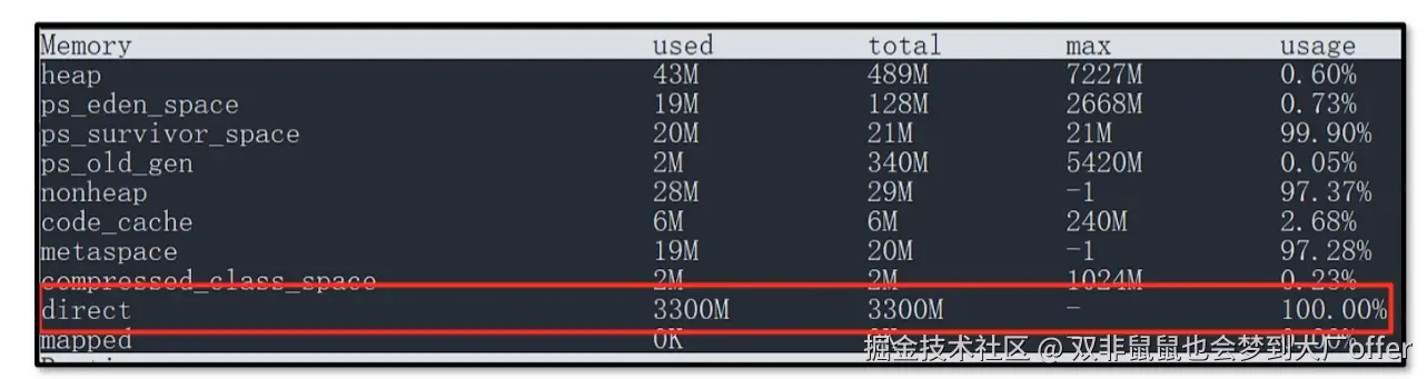 Arthas的memory命令可以查看直接内存大小,属性名为drect