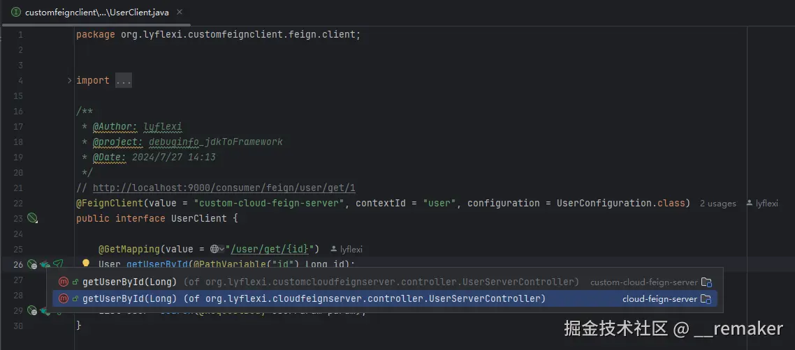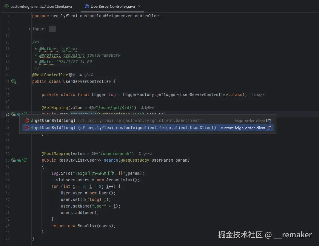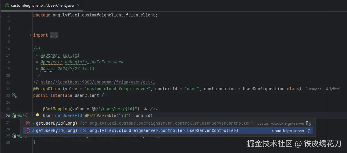 简而言之,您可以通过方法级导航按钮灵活地在FeignClient和远程服务ApiController之间来回切换。