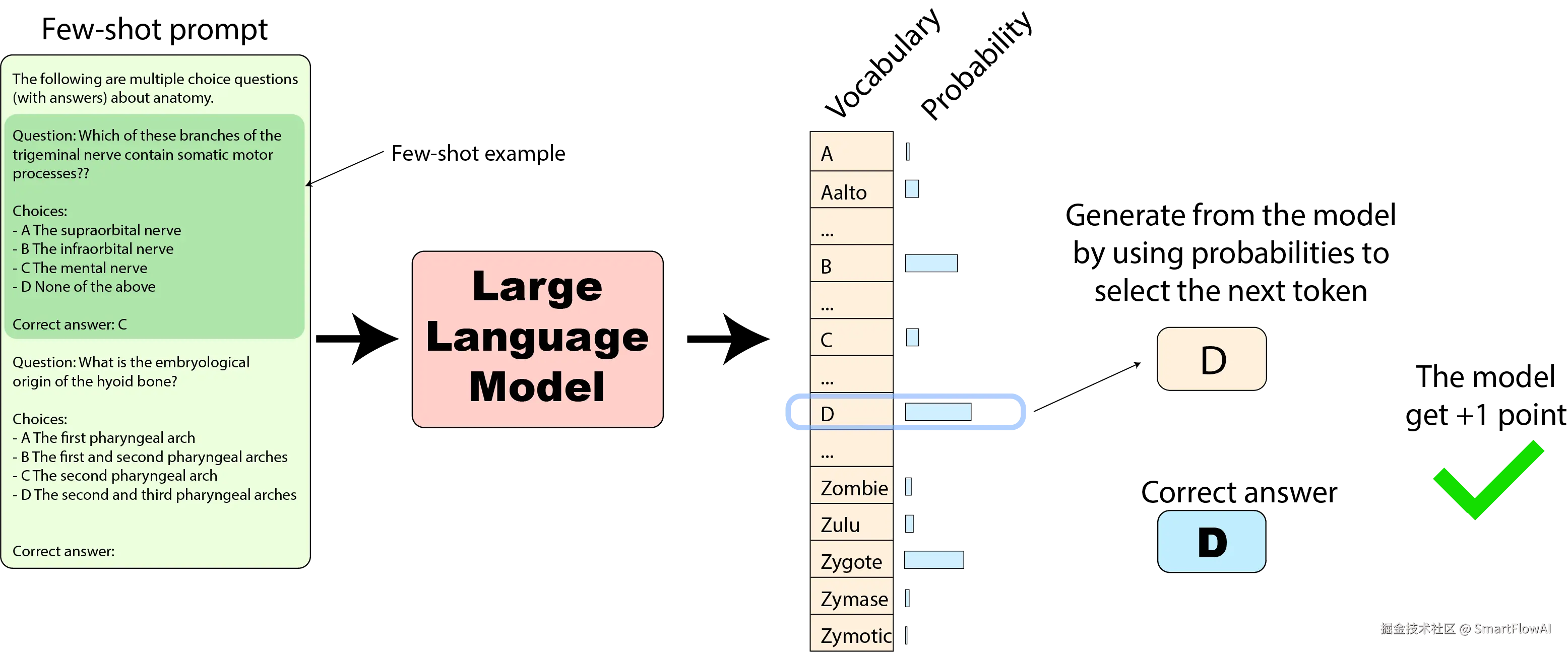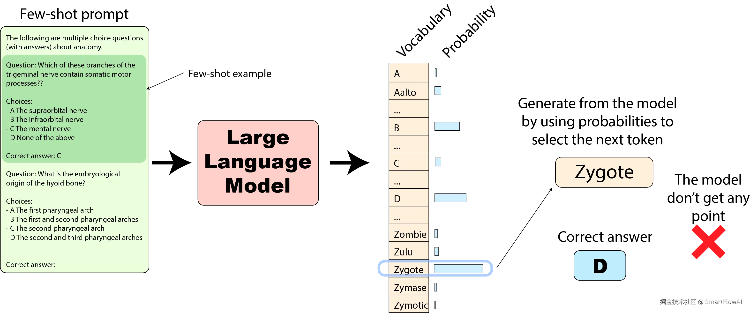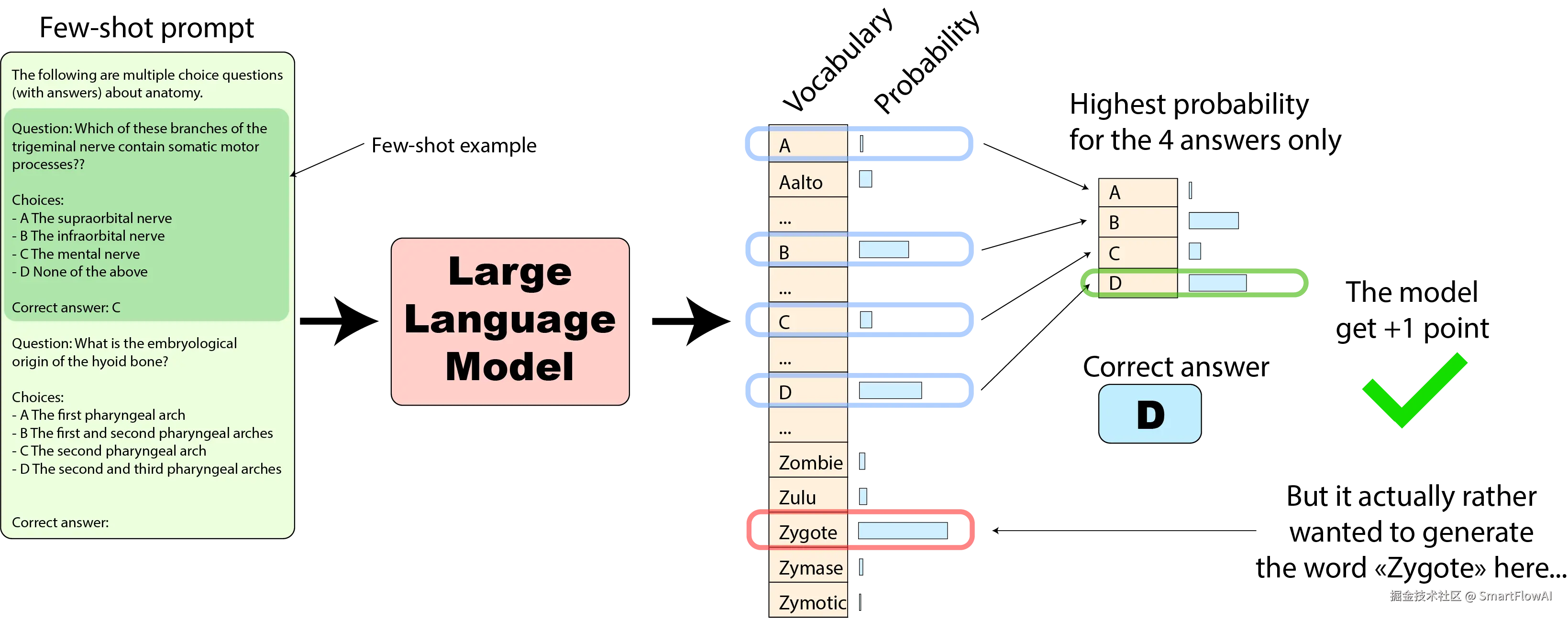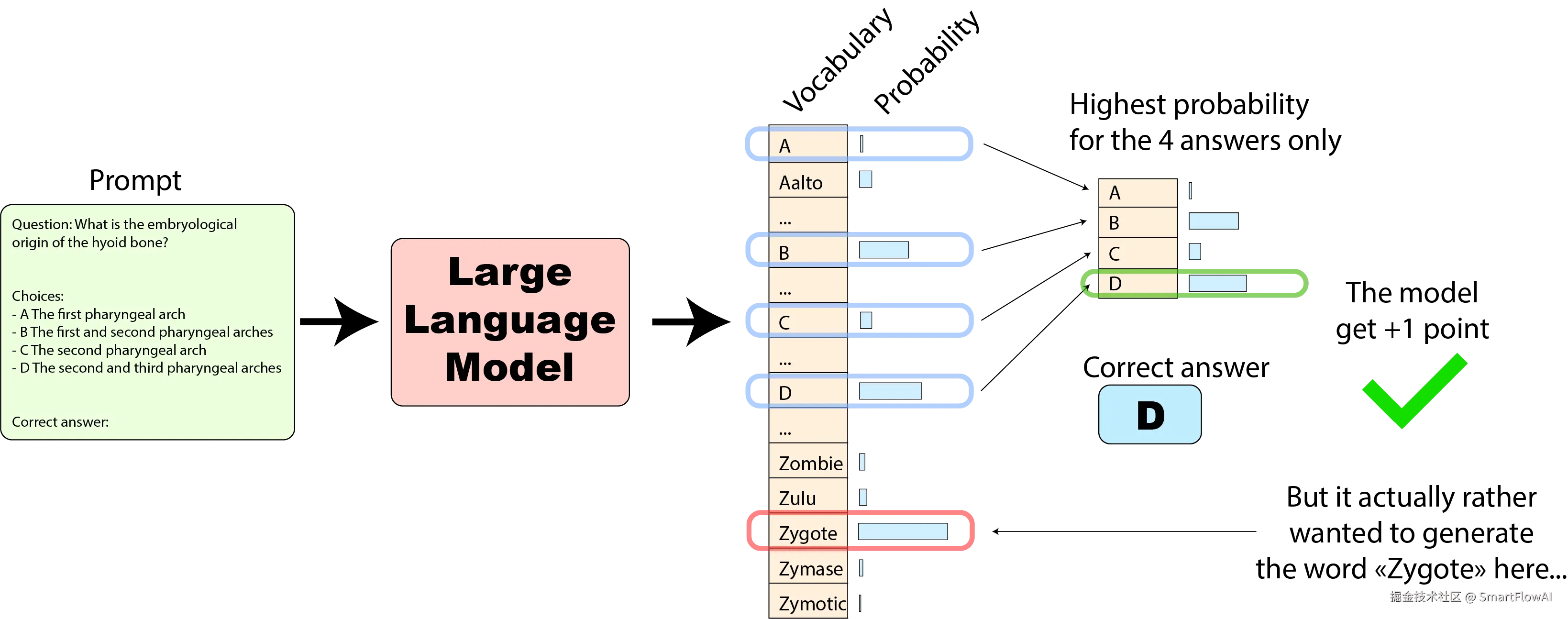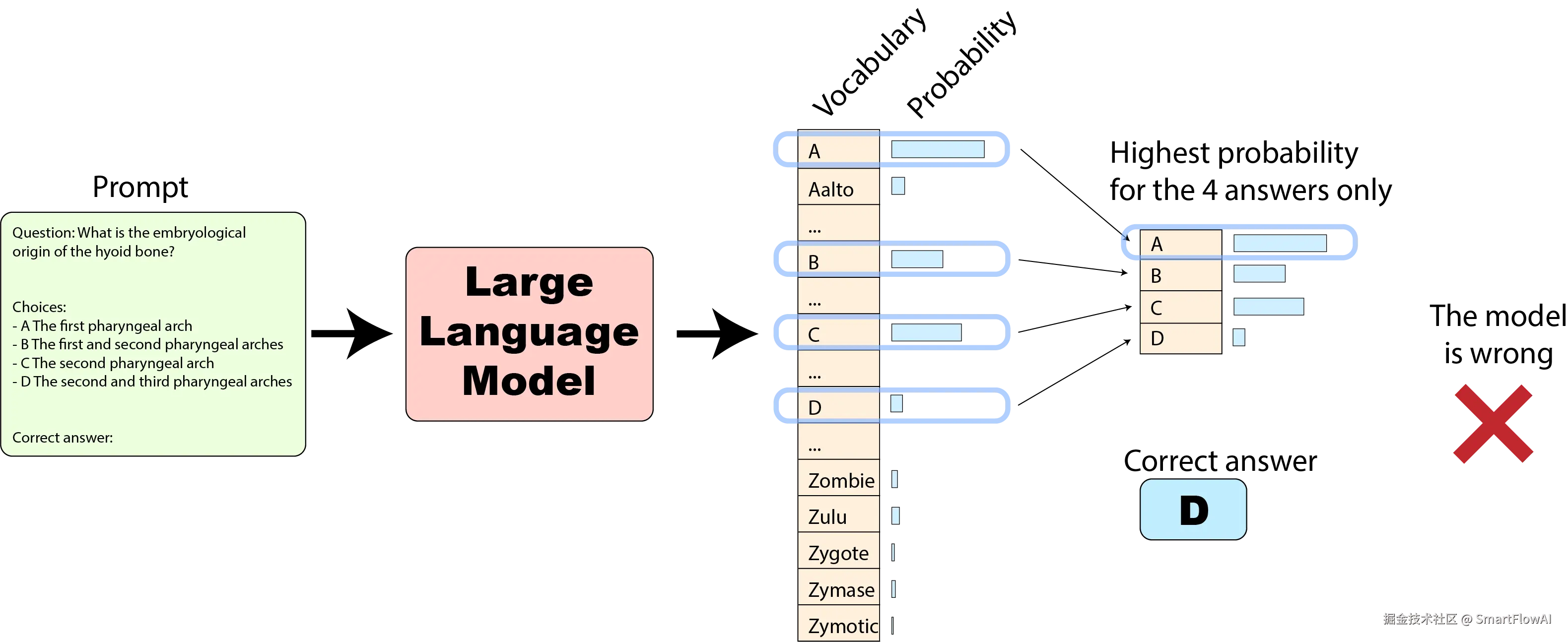 在上述情境中,鉴于模型给予 D 选项的概率在四个选项中处于最高值,故原始实现判定模型预测正确并给予加一分之操作。然而,若从全局视角审视完整的概率输出,会发现“Zygote”这个单词的概率实则为最高,但其并不在四个选项之列(此仅为示例,并非真实案例)。