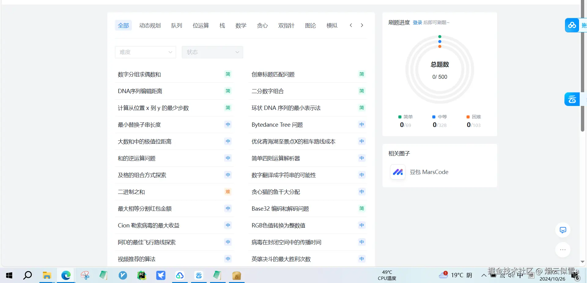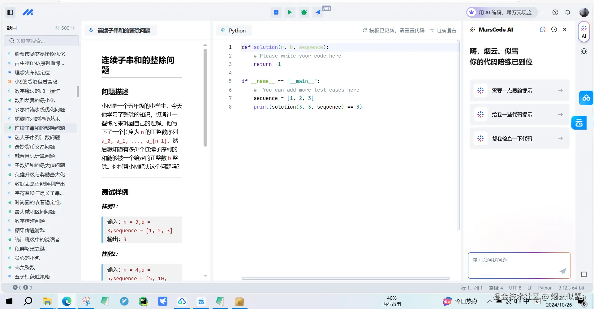 你可以在左侧的题目列表中选择自己感兴趣的题目,随后在右侧的代码编辑区域进行编写,并通过 AI 助手协助自己完成解题。