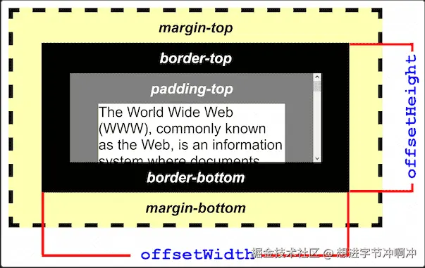 - offsetWidth: 元素在水平方向上占用的像素尺寸,包括它的宽度、垂直滚动条宽度和左、右边框的宽度。