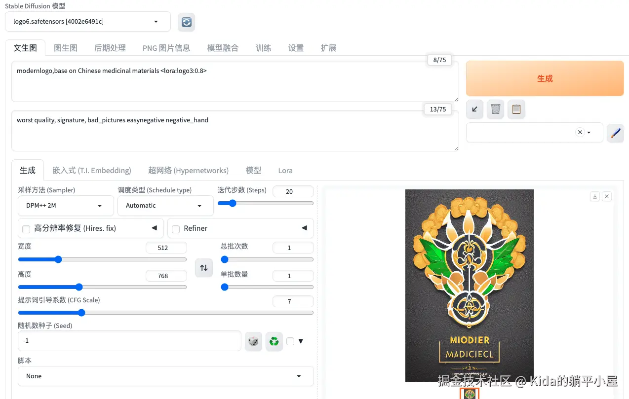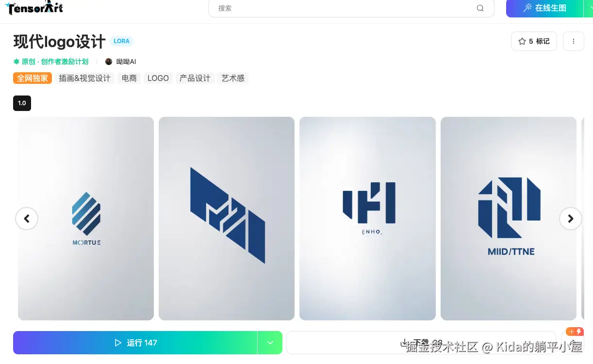 至此,SD 的部署就基本结束了。接下来我们还需要验证一下整个结果如何,我在吐司 TusiArt 下载了一个 logo 设计模型,如下图: