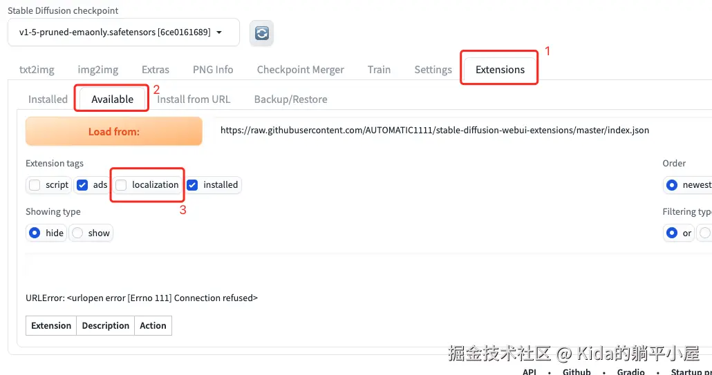 选择 Extensions -> Available -> 反选 localzation,之后就可以点击 load from 按钮。Boom!!直接报错
