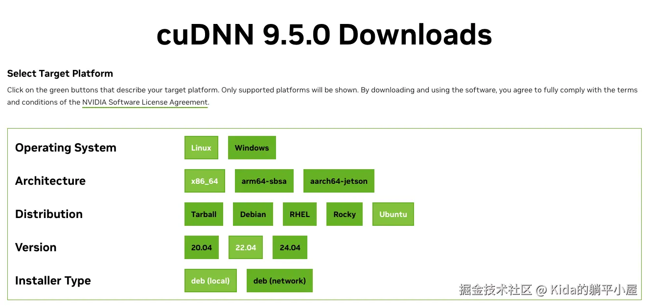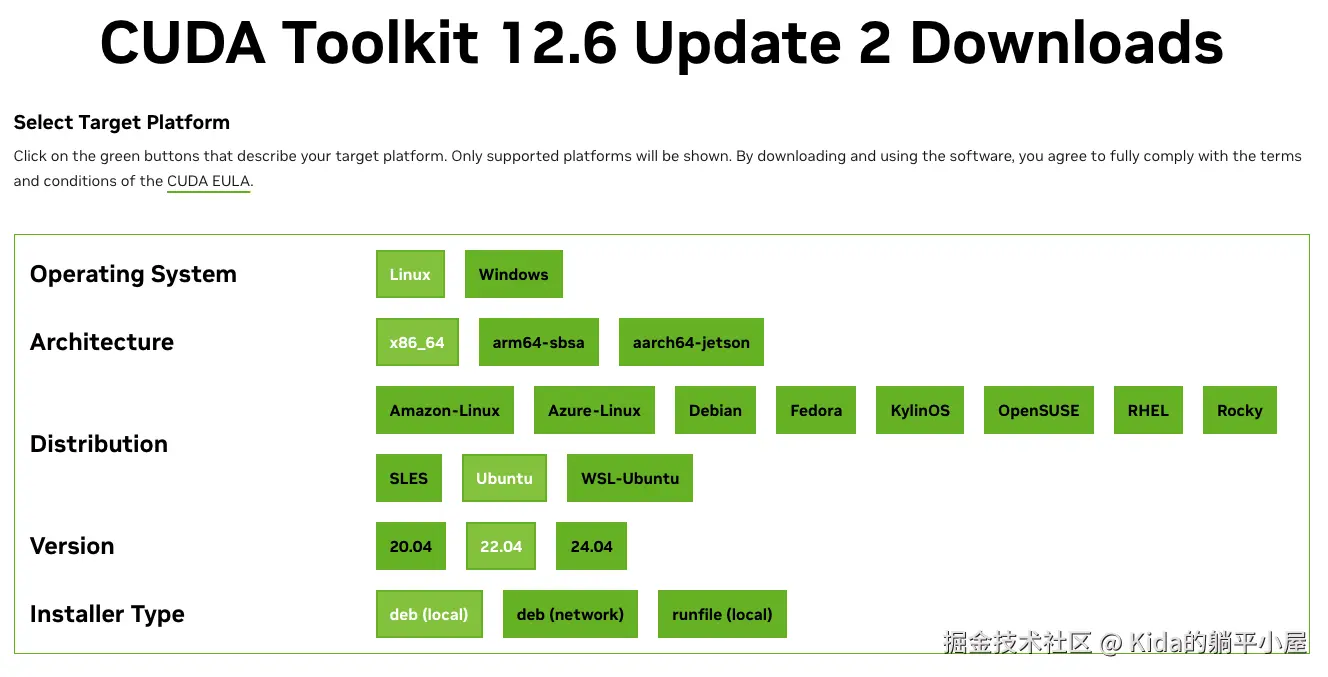 逐级选择对应信息后,网页下方将会出现 CUDA 获取提示,这里只需跟步骤执行即可。