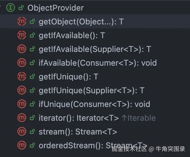 ObjectProvider 是 Spring 框架中提供的一个接口,位于 org.springframework.beans.factory 包下。它是 ObjectFactory 的子接口,旨在提供更为灵活和强大的 Bean 获取机制。ObjectProvider 主要用于以下几种场景: