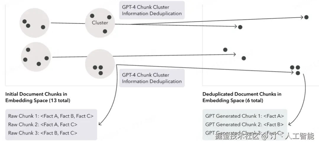 本方案通过在 embedding 空间中对块进行 k-means 聚类来去重信息,以便每个块聚类中的总 token 数在 LLM 的有效上下文窗口内。然后,本文可以任务 LLM 从原始聚类中输出一组新的提炼块,去除重复信息。如果一个给定的聚类包含 N 个块,本文期望这个去重提示输出 <= N 个新块,其中任何冗余信息都被去除。