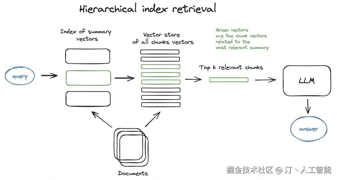 由 LLM 生成摘要并对摘要进行检索可以使得检索过程更为高效。上节使用 LLM 提高信息密度的方法类似于无损压缩,而使用 LLM 生成摘要更像有损压缩。在大型数据库的情况下,一种有效的方法是创建两个索引 — 一个由摘要组成,另一个由文档块组成,并分两步进行搜索,首先通过摘要过滤掉相关文档,然后在此相关组内进行搜索。