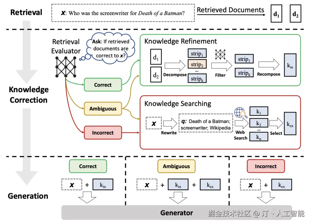 Corrective RAG[4] 是一种由 Yan 等人首次提出的方法,其中 T5-Large 模型被训练用于在将结果提供给大型语言模型(LLM)以生成最终响应之前,识别 RAG 结果是否正确 / 相关、模棱两可或不正确。未通过正确 / 相关或模棱两可分类阈值的 RAG 结果将被丢弃。与使用经过微调的 Llama-2 7B 模型和 Self-RAG 的批判方法相比,使用 T5-Large 模型要轻量得多,并且可以与任何大型语言模型结合使用。