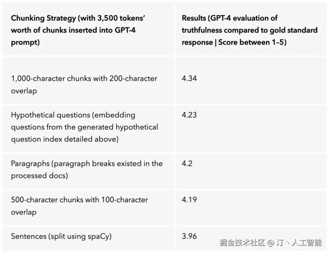 在构建 AI 助手时,本文发现分块策略的选择并没有太大影响(见下表结果)。1,000 字符的分块策略,带有 200 字符的重叠,表现略优于其他策略(当然,构建不同的应用可能会出现不同的测试结果)。