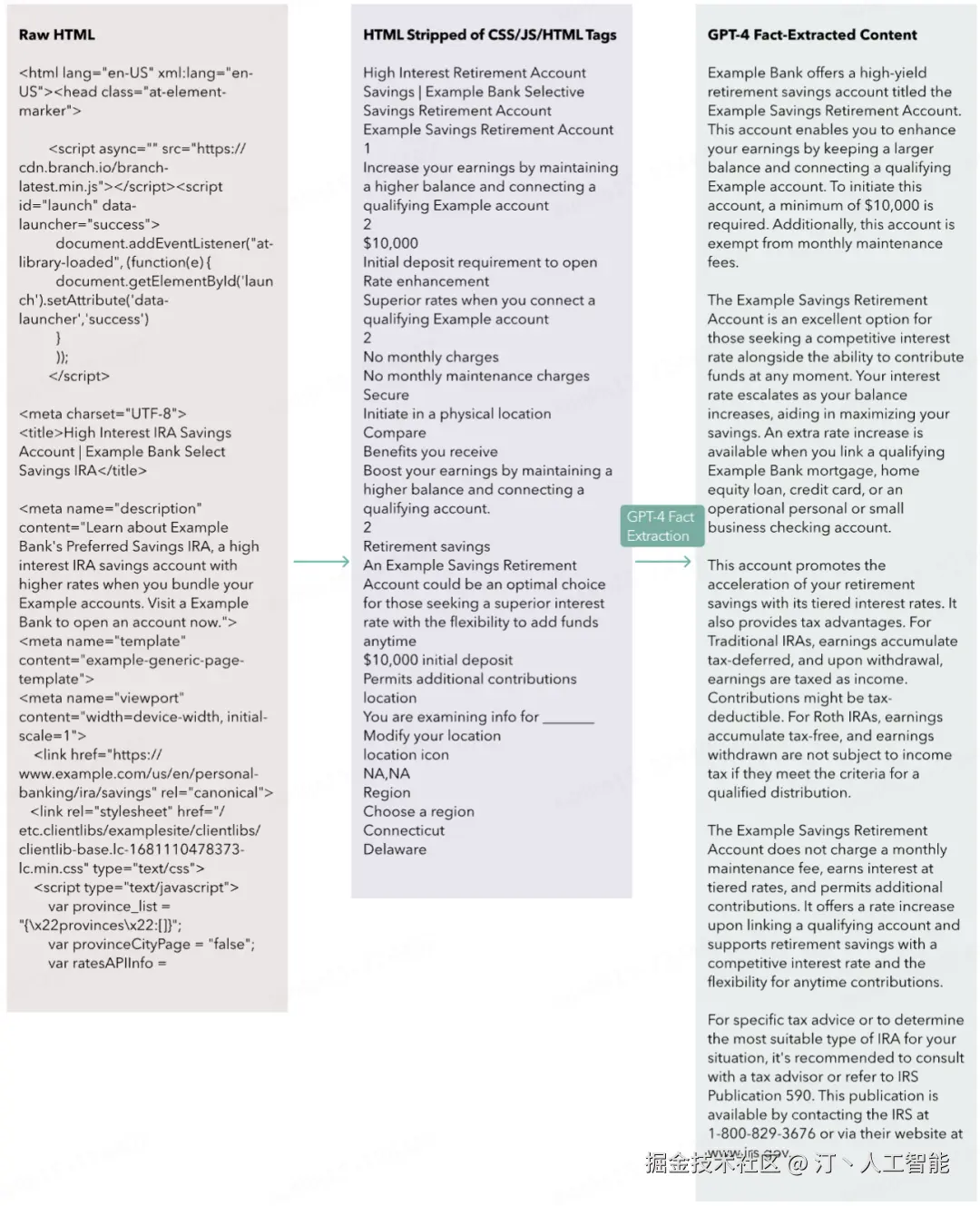 比如当原文本来源于网页时,原始 HTML 包含了大量无关信息(例如 CSS 类、页眉 / 页脚导航、HTML 标签等冗余信息)。即使在程序化地剥离了 CSS 和 HTML 之后,信息密度仍然很低。因此,为了提高块中的信息密度,本文尝试使用 GPT-4 作为事实提取器,从文档中提取相关信息。