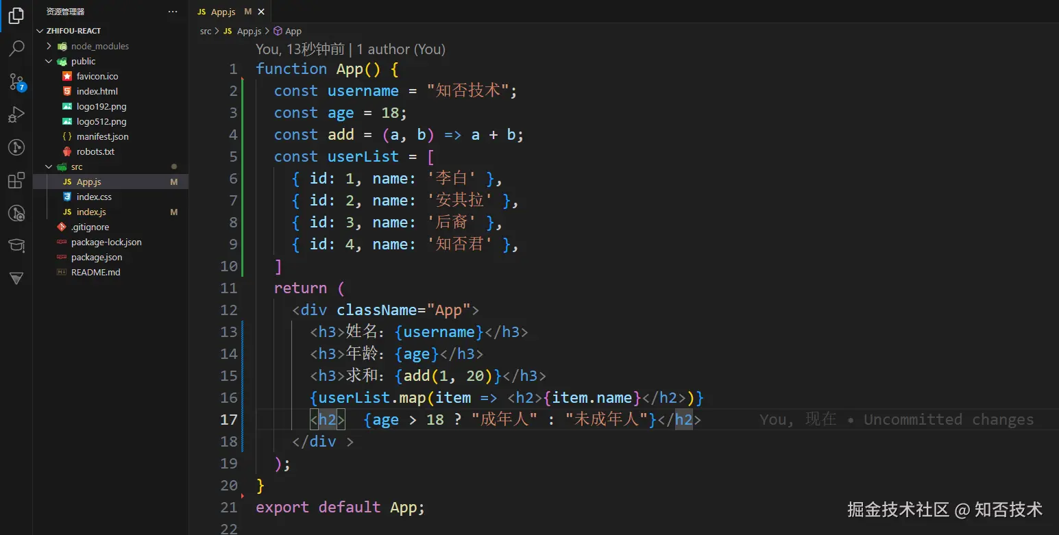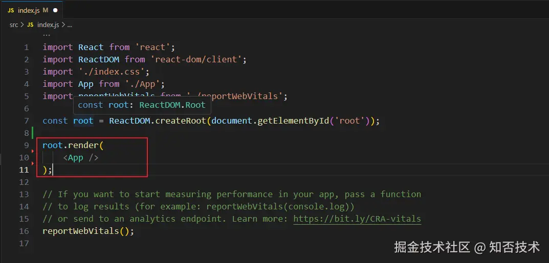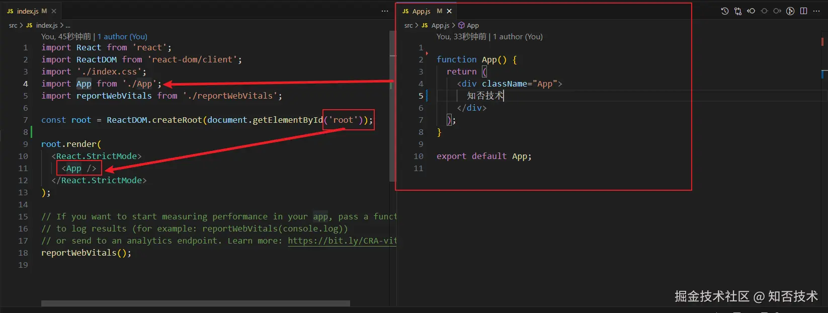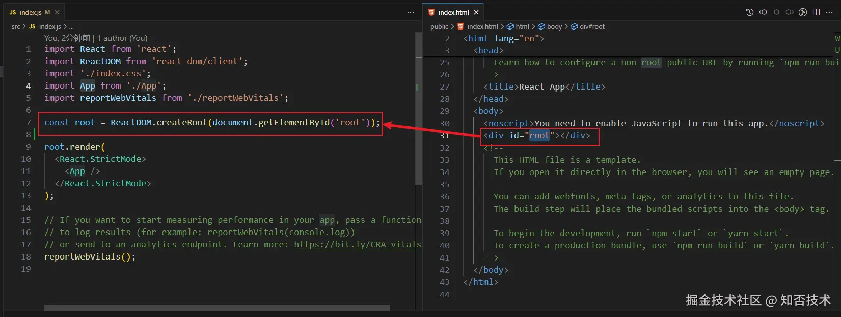 先获取 index.html 里面 id 为 root 的根节点,然后将 App 组件渲染到该节点上。所以启动项目后显示的是 App.js 里面的内容。